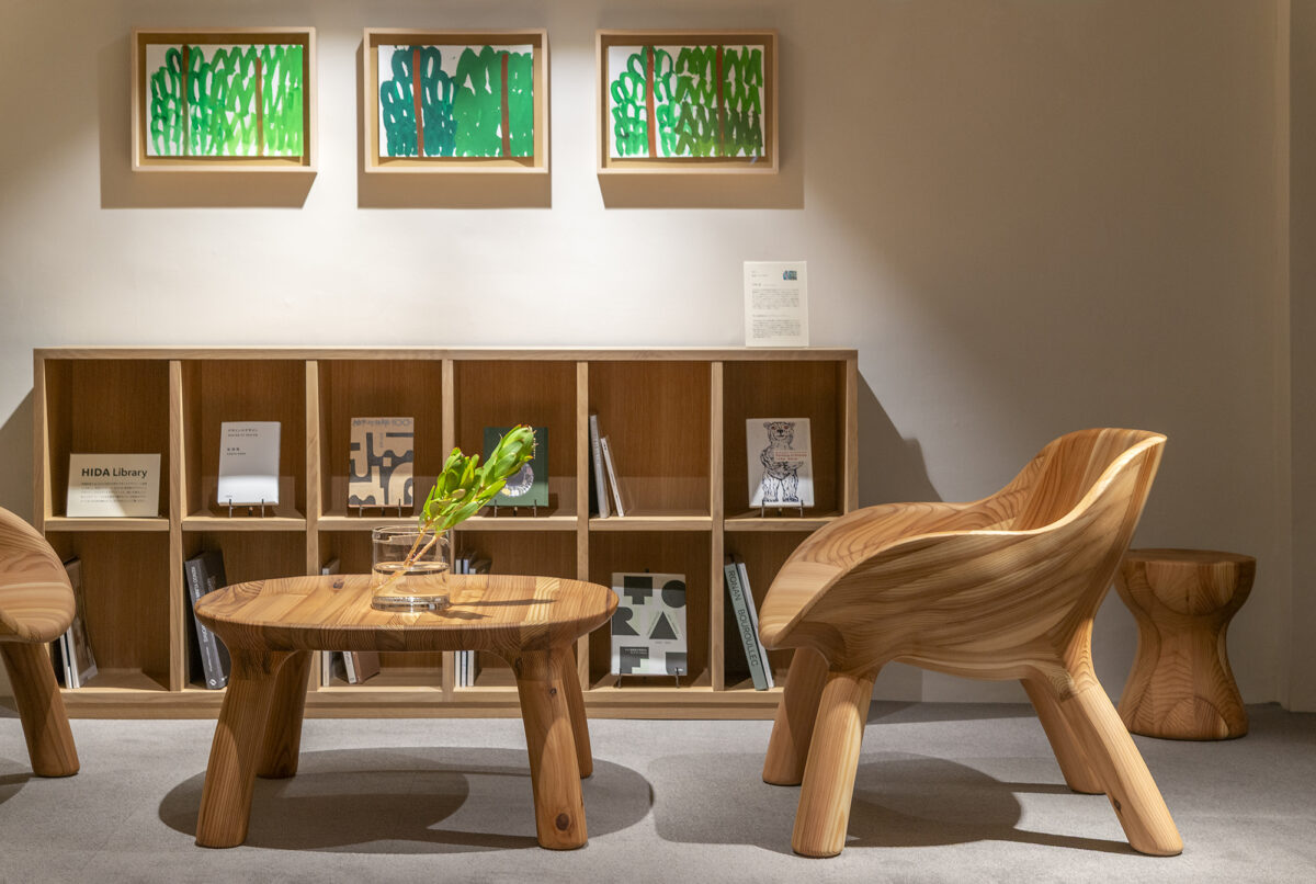 HIDAのコレクションの中には、エンツォ・マーリや柳宗理、隈研吾など国内外で活躍する建築家やデザイナーとの協働によって生まれた家具が数多く存在します。そうしたデザイナーへの敬意と、飛騨産業のものづくりの姿勢を伝える場として、関連書籍を集めたライブラリーと、国際的なアワードの受賞作を紹介する展示コーナーを新たに設けました。HIDAの家具の背景にある思想や物語に触れていただけるスペースです。