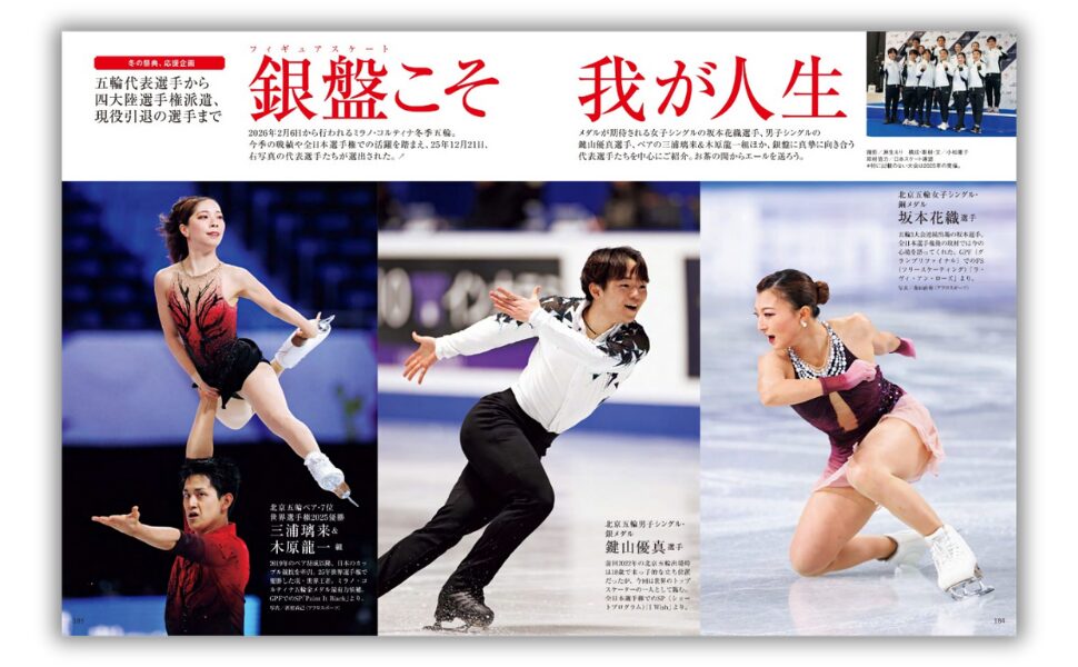 2月6日から行われるミラノ・コルティナ冬季五輪。メダルが期待される女子シングルの坂本花織選手、男子シングルの鍵山優真選手、ペアの三浦璃来&木原龍一組ほか代表の千葉百音選手、中井亜美選手、佐藤駿選手、三浦佳生選手、長岡柚奈&森口澄士組、吉田唄菜&森田真沙也組、そして1月に開催された四大陸選手権で活躍した青木祐奈選手、山本草太選手、友野一希選手、今季での現役引退を表明した三原舞依選手、樋口新葉選手、壷井達也選手、江川マリア選手をご紹介。銀盤に真摯に向き合う姿をご覧ください。