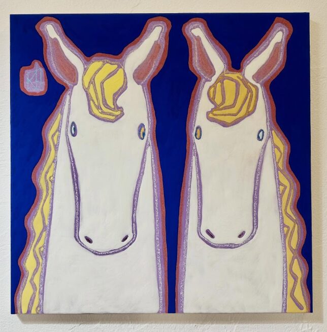 「馬が合う 45.5×45.5cm, 2026年, 麻紙, 岩絵具, 膠, クレヨン