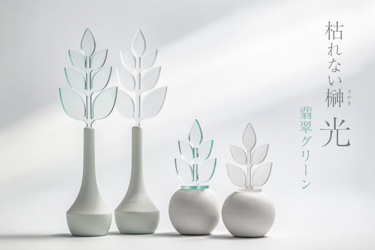 【 枯れないサカキ[ 光 ]】に、レトロなガラス調の新色「翡翠グリーン」が登場。