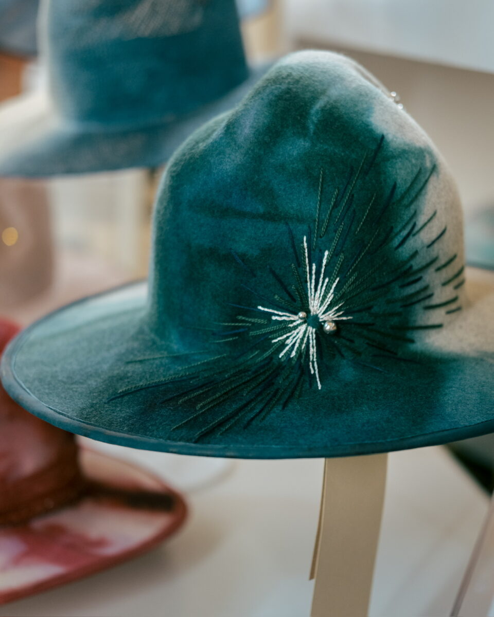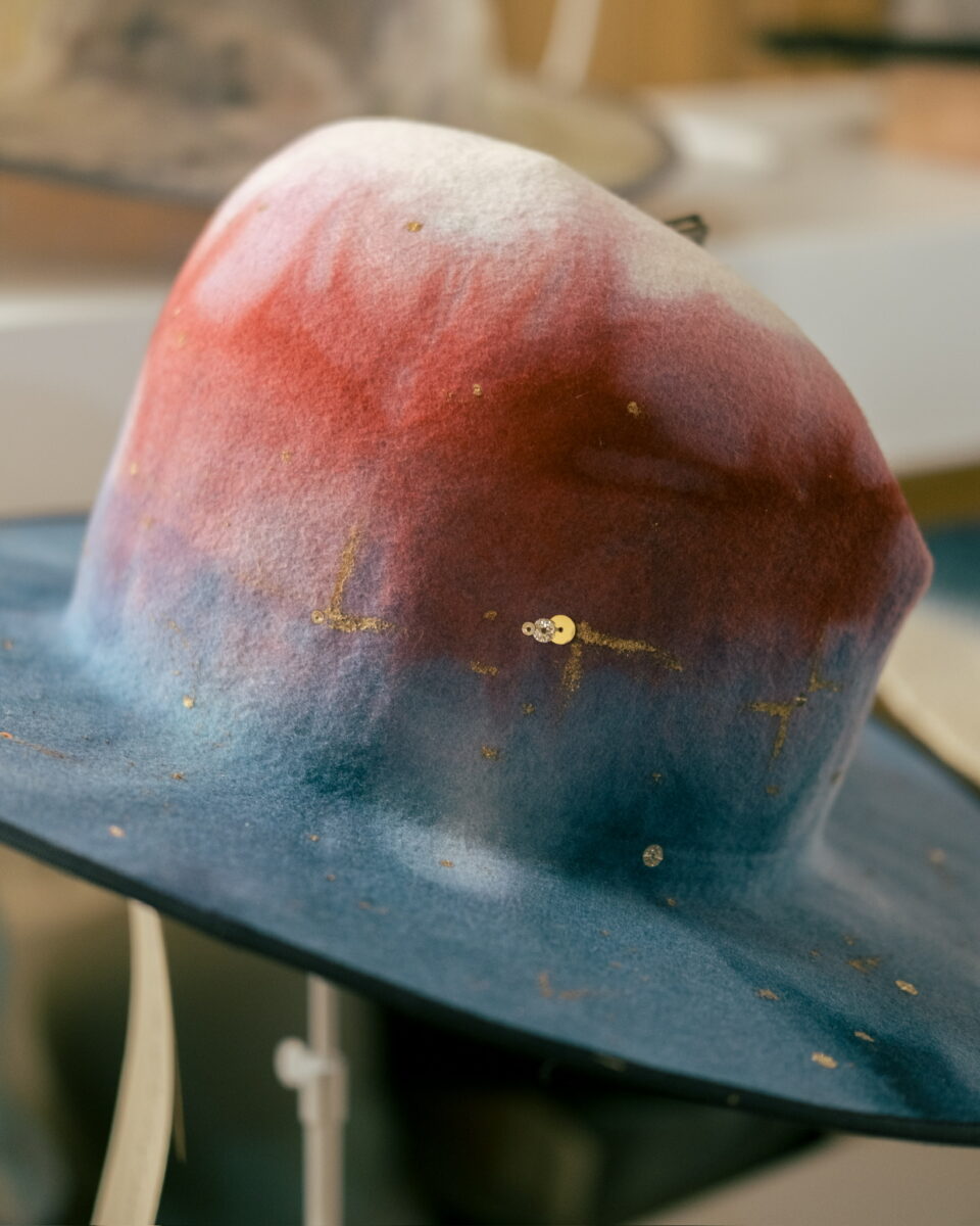 本展は「Magic hour collection」と題して、夕暮れに移ろう空の色彩を、一点一点丹念に染め上げた帽子で表現。本展に寄せてtmh.より、帽子をカスタムできるスタッドピンも登場します。