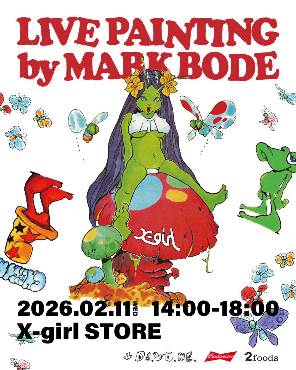 また、今回のコラボレーションを記念して、アーティストMark Bode氏によるライブペインティングイベント、「LIVE PAINTING by Mark Bode」を、2026年2月11日(水・祝)14:00〜18:00に、X-girl STORE(東京都渋谷区神宮前)にて開催いたします!