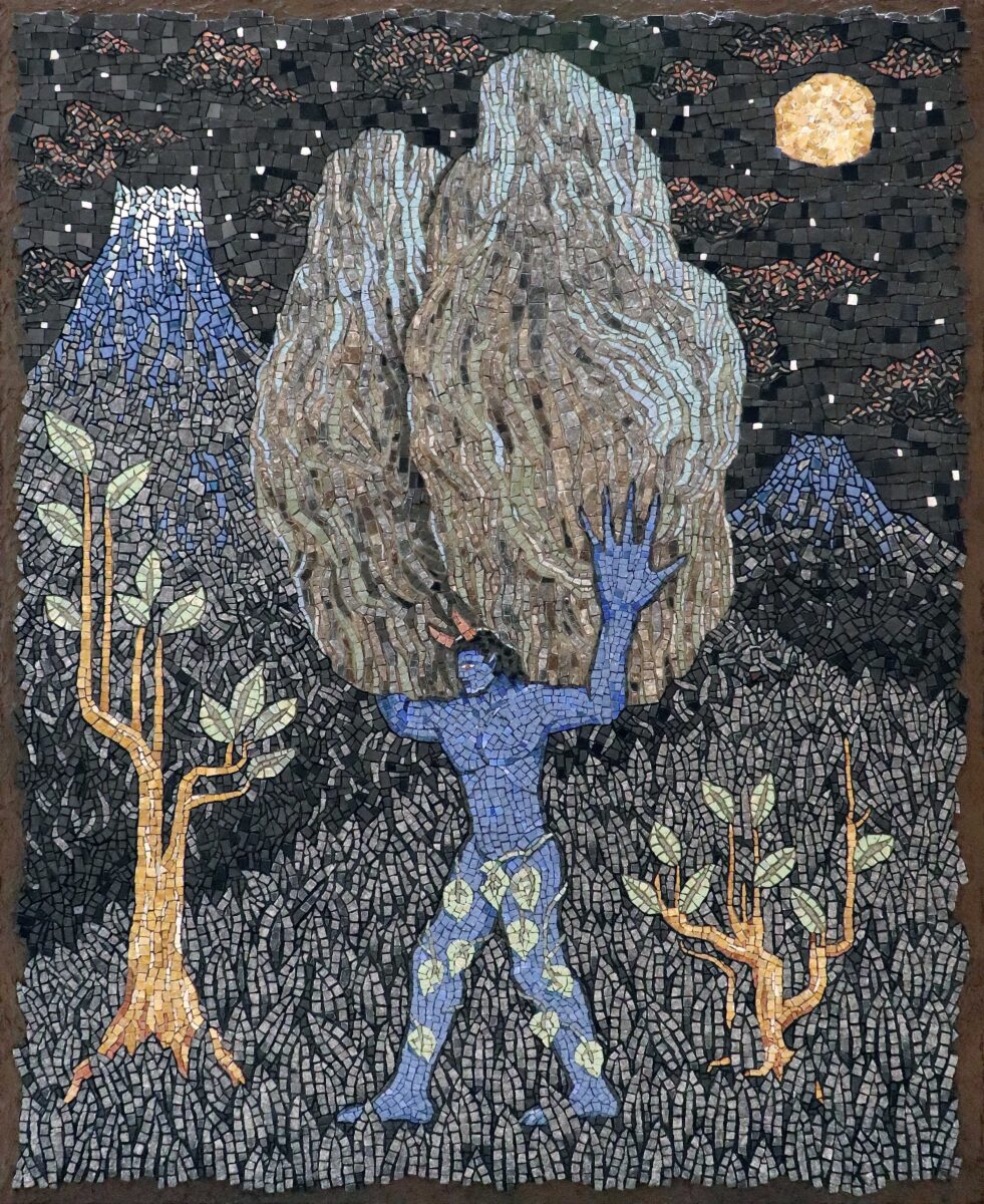 ひたすら石を割り続けるというモザイク制作における反復行為を、山に住む精霊によって森に反響する「こだま」に喩え、これまでの代表作と、箱根にまつわる伝承を取り上げた過去最大の最新作によって会場を構成します。