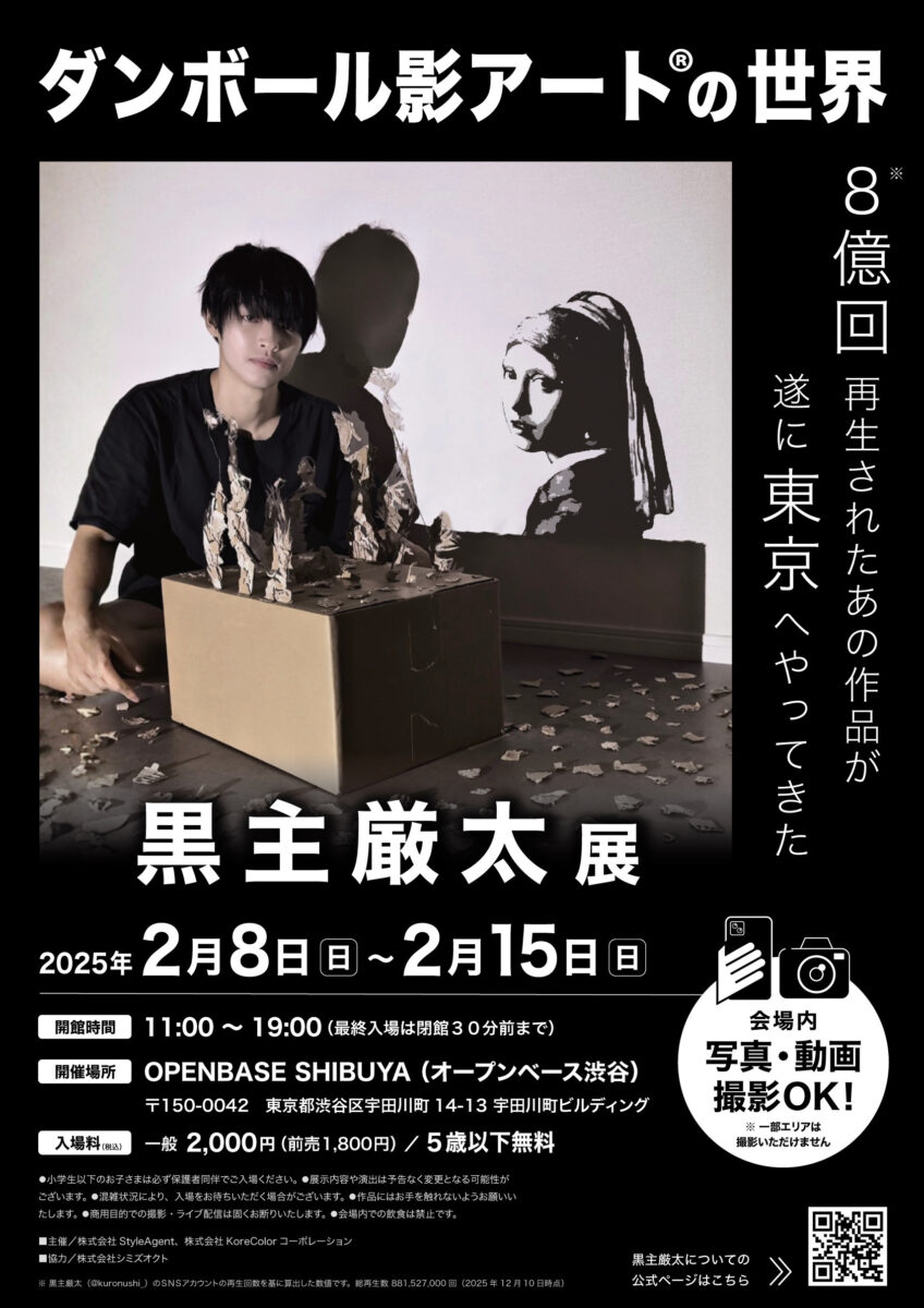 黒主厳太は、身近な素材であるダンボールと、誰もが知る光と影を用い、影そのものを主役にした独自の表現「ダンボール影アート」を2021年に発案。作品はSNSを中心に世界中へ拡散され、総再生回数は累計8億回以上、SNSフォロワー数は300万人を超えています。