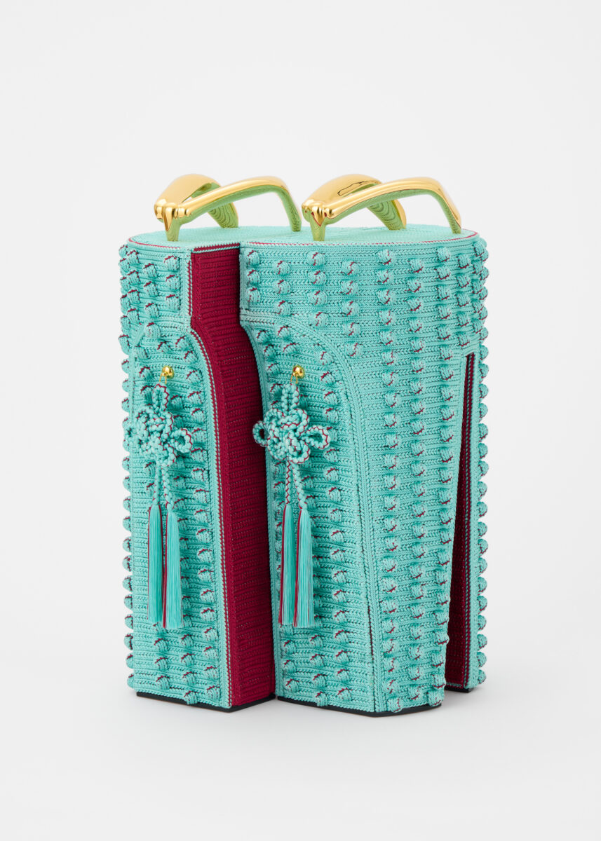 舘鼻則孝は、「装うこと」を身体の外観的な装飾ではなく、社会的役割や儀礼、価値観を身体に刻み込む行為として捉え、日本の伝統文化を現代的に再構築してきた作家である。本展では、代表的な《Heel-less Shoes》を、江戸組紐の高度な技法を用いて制作し、パラッツォの2階に残るかつての居住空間に展示する。