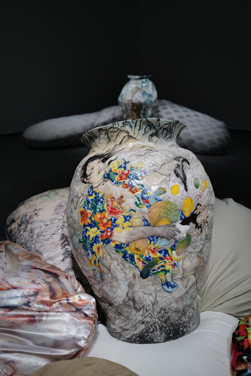 川井雄仁は、陶を単なる素材としてではなく、欲望や虚構、アイデンティティの揺らぎを投影する媒体として用い、過剰な色彩と量感を伴う造形を展開してきた。その背景には、1990年代の原宿文化やストリートファッション、マスメディアが生み出したイメージへの強い影響がある。消費的で甘美な表層と、現実との乖離が生む違和感や不安定さが、川井の作品には常に併存している。