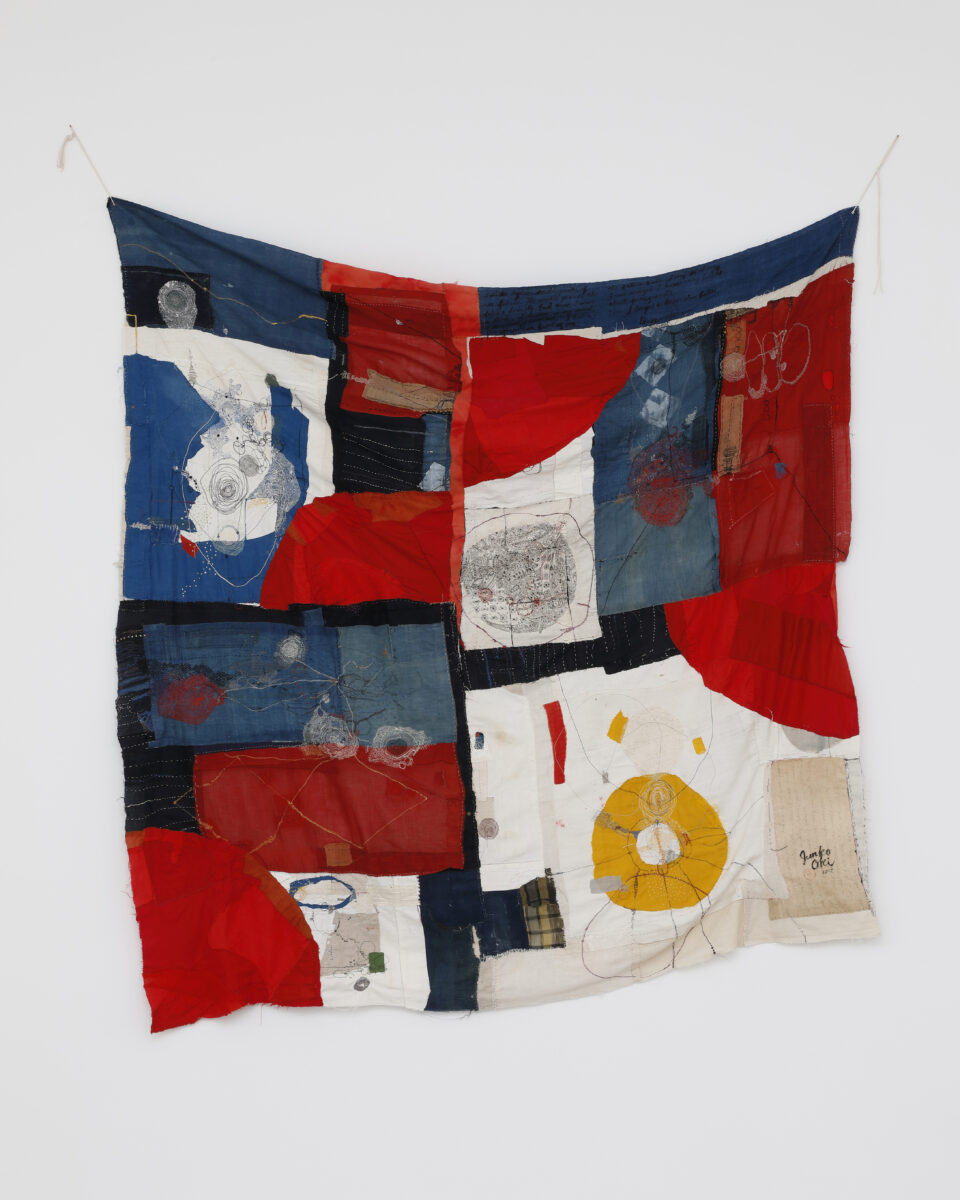 親密で私的な空間において、刺繍された布は装飾ではなく、日々の生活の中で積み重ねられてきた感情や記憶の堆積として知覚される。光の移ろいと鑑賞者の移動に伴い、布の陰影や質感は変化し、家庭という場に内在する静かな労働の時間が、身体的な感覚として呼び覚まされる。沖の作品は、居間という空間を通して、ケアや反復、沈黙を含んだ制作行為の価値を、あらためて問いかけている。