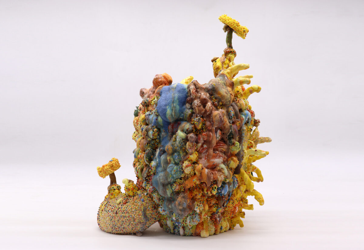 桑田卓郎は、陶芸における伝統的技法や形式を意図的に過剰化し、器と彫刻、日常と非日常の境界を攪拌する実践を続けてきた作家である。貫入、石はぜ、釉薬の流動や破裂といった、通常は欠点や失敗とみなされがちな現象を積極的に引き受けることで、完成と崩壊が同時に立ち現れる造形を生み出してきた。その作品は、用のための器でありながら、制度化された陶芸の枠組みを逸脱する彫刻的存在として振る舞う。