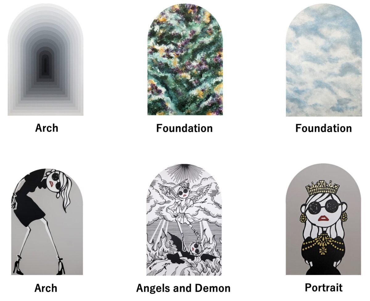 本展では、アーチ形キャンバスに描かれた新作平面作品をはじめ、複数のアーチをレイヤードした代表作《Arch》など、テーマを体現する新作を含む、約150点におよぶ作品を展示・販売いたします。一見グラフィカルに見える作品はすべて手描きによるもので、ひと筆ひと筆、絵の具を重ねることで生まれる微細な揺らぎや奥行きが、作品に独自の温度と深みをもたらしています。
