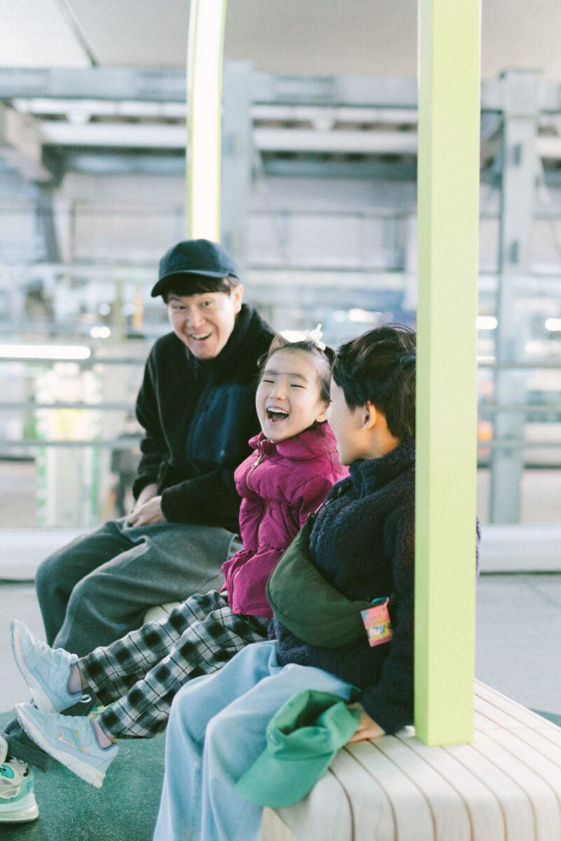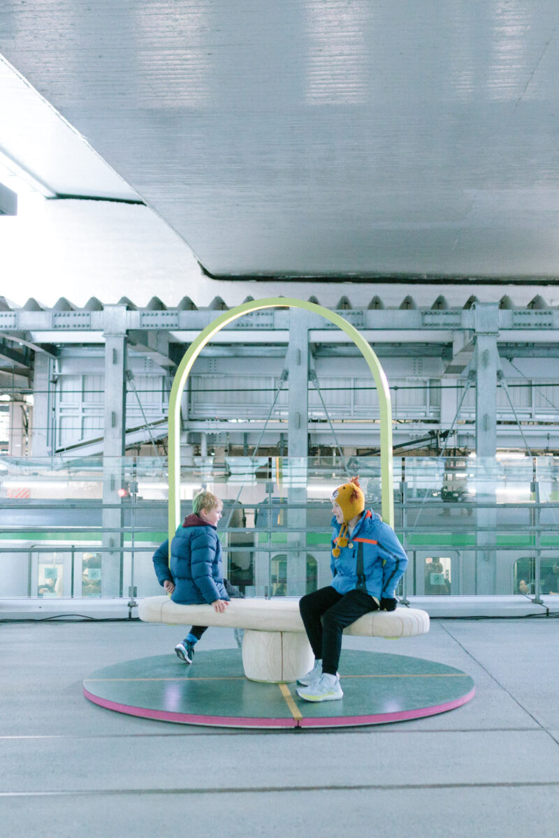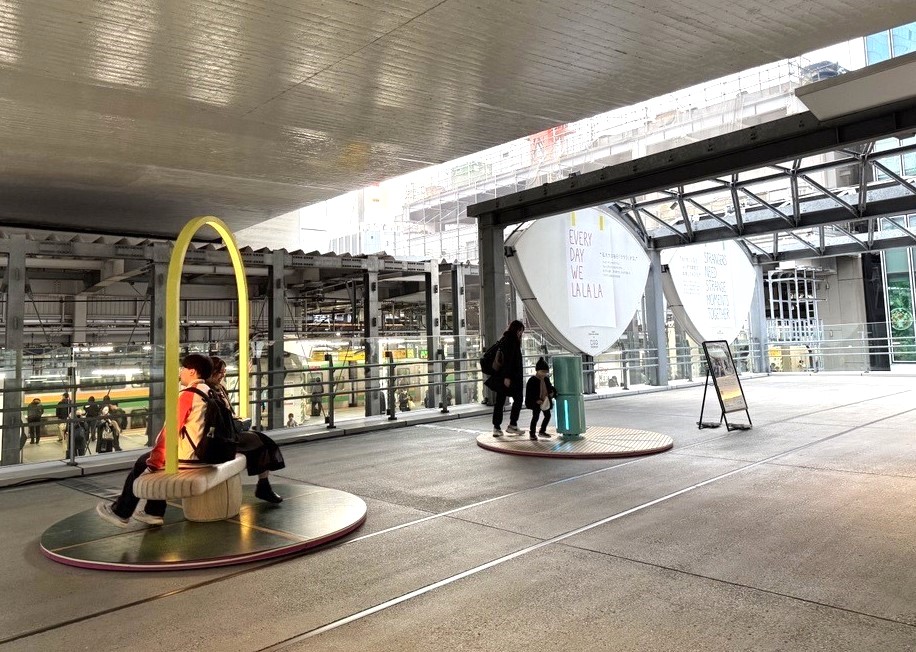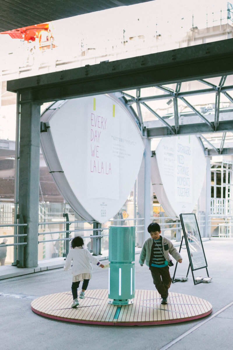《Duetti》の設置場所は、国道246横断デッキ(旧東急東横線ホーム)です。中庭のような広がりのある空間ですが、少し奥まった場所でもあるので、いろんな人に気づいてもらえるように、かつて東横線渋谷駅のシンボルだった「カマボコ屋根」の下のパネルにキャッチコピーを看板にして掲げています。目的地に向かって忙しく行き来する人たちがふと目を留め、《Duetti》に乗って、つかの間でもストレスから解放されて楽しんでくれたらうれしいです。