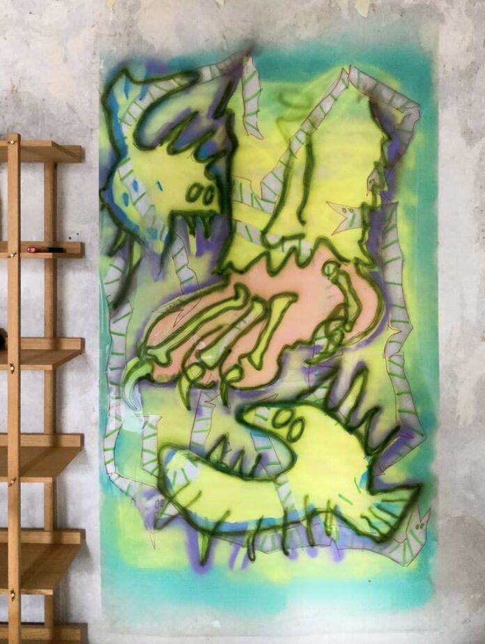 展示された絵画作品は、コラボレーションシューズと同様に、タイに生息する「エキゾチック」な生き物たちをモチーフとし、透明なアセテートフィルムの上に描かれています。そこには、危険さとユーモアが共存する独特の世界観が表現されています。