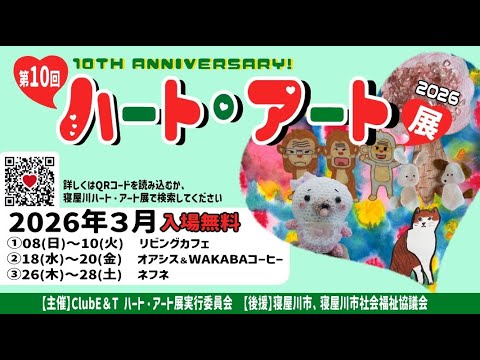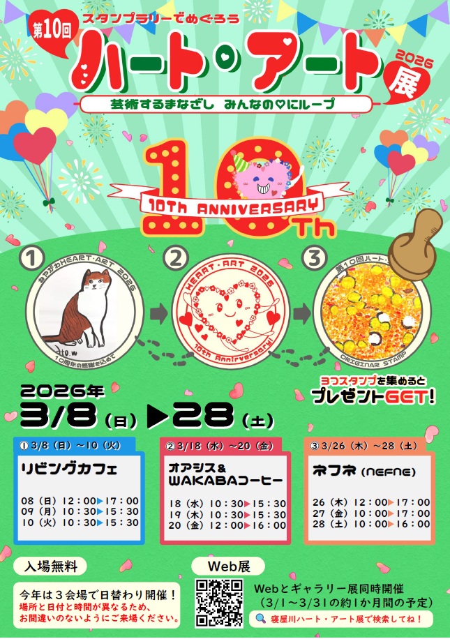 2015年3月の第1回開催から、今年で10周年を迎えます。この10年の間に、作品を通じてたくさんの「出会い」と「つながり」が生まれ、ハート・アート展は少しずつ地域に根づいてきました。これまで歩みを続けてこられたのは、作品を届けてくれたアーティストの皆さんはもちろん、足を運んでくださった来場者の方々、運営を支えてくれた関係者の方々、そして何より、地域の皆さまのあたたかい応援と見守りがあったからこそです。