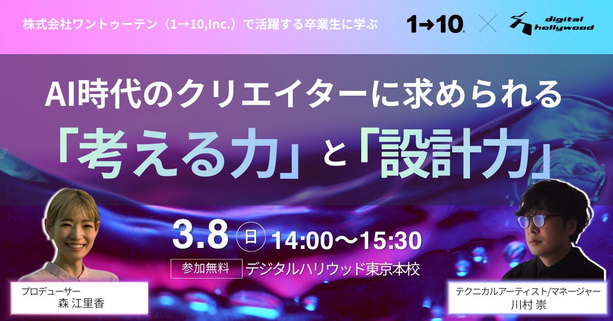 IT関連及びデジタルコンテンツの人材育成スクール[デジタルハリウッド] (運営会社:デジタルハリウッド株式会社、本社/本校:東京都千代田区、代表取締役社長兼CEO:藤井雅徳、学長:杉山知之)では、株式会社ワントゥーテンの川村崇氏、森江里香氏をゲストに迎え、「AI時代のクリエイターに求められる「考える力」と「設計力」 ~プロデューサー・テクニカルアーティストが語る“一緒に働きたい人“になるためのリアルな話~」を2026年3月8日(日)に開催いたします。