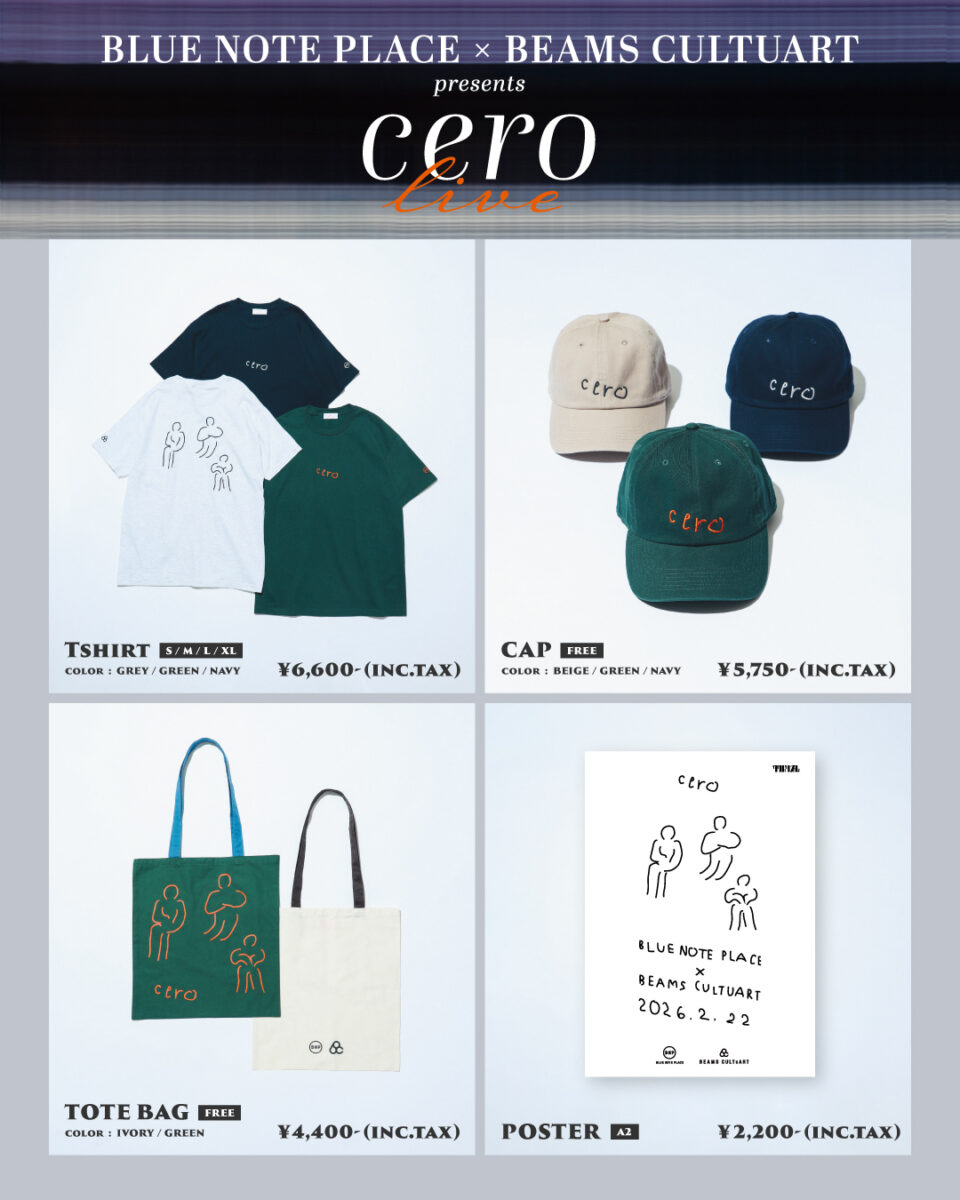2月22日(日)開催の『BLUE NOTE PLACE × BEAMS CULTUART presents cero live』会場内特設ブースにて、Tシャツ等全4型を販売。