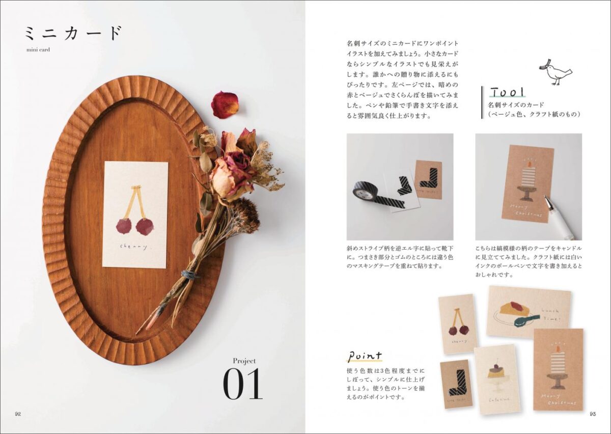 PART01では使いやすいマスキングテープの紹介や基本的なやり方を丁寧に解説。テープを重ねて貼って風景にしたり、円に沿って貼ってドーナツにしたり。いろいろなイラストを描くための基本をご紹介します。