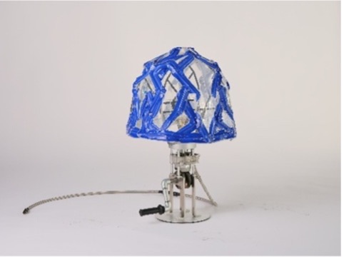 ただ照らすだけではない、ヤマハ発動機のエンジンの機能美に触れて学べる照明です。 8mm厚のアルミ一体成型で作られた土台には、本物の4ストロークエンジンの機構を搭載。ハンドルを手で回すとギアが噛み合い、ピストンが往復。実際のエンジン同様、圧縮・爆発のタイミングに合わせてLEDが点灯するギミックを組み込みました。 光を拡散するシェード部分には、塗装工程で使われた「ハンガー(吊り具)」を骨組みにし、タンク用デカールの端材をパッチワークのように配置。廃材の隙間から漏れる不規則な光が、エンジンの鼓動をドラマチックに演出します。