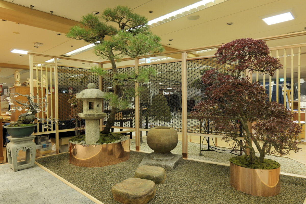 百貨店という屋内空間の中に、敷き庭や石組を基調とした自然の景色が現れ、その中に本展のために制作された一点物の器と、風格ある盆栽が配置されます。
