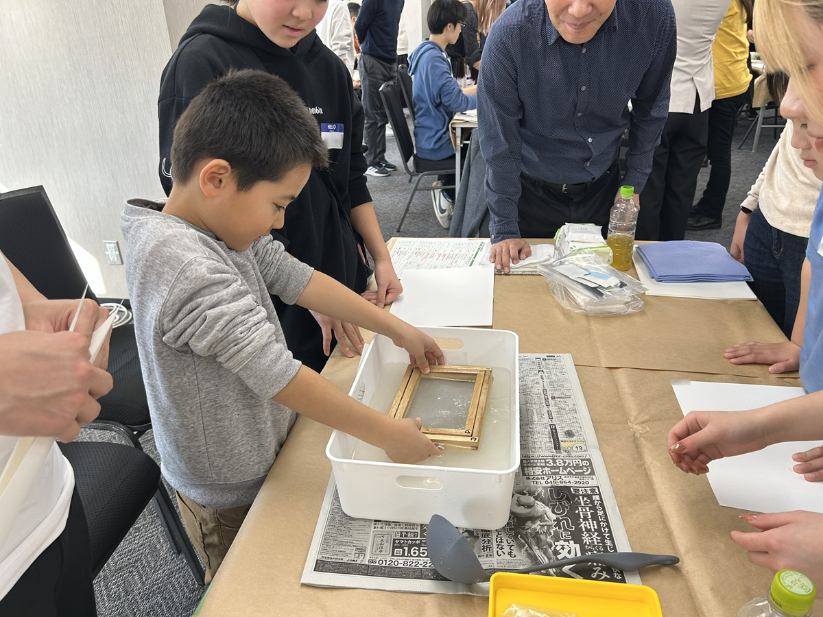 武蔵野大学工学部サステナビリティ学科の学生による分かりやすい説明のもと、子どもたちは実際に紙漉きに挑戦し、身近なバナナが紙へと姿を変えていく工程を体感しながら、自分だけのバナナペーパーを完成させました。さらに、自ら作成したバナナペーパーに色付けを行い、その紙を使用してオリジナルのキーホルダーや缶バッジを製作するなど、ものづくりの工程を楽しみながら取り組みました。