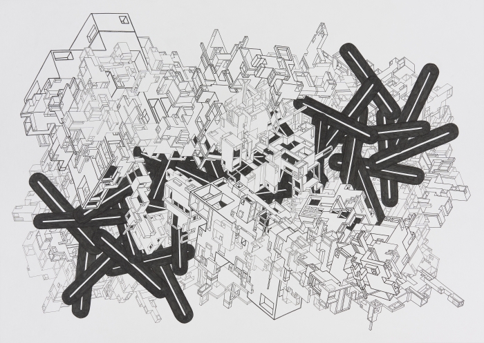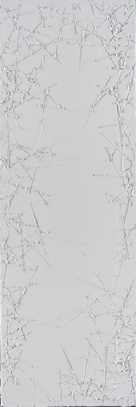 本展では、複雑に重なり合う無機質な街の構造の中に、「棒状の物体」を有機物の象徴として重ね合わせ、その強さと永続性を表現しました。ビルとビルとの細い路地を歩き、ふと上を見上げると、切り取られた青い空を白い雲が左右に流れていきます。時間と空間の圧迫から自分自身を解放することは、大きな街の真ん中でもできると私は信じています。本展が、人としての個の逞しさを感じる機会となれば幸いです。