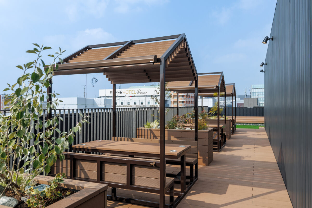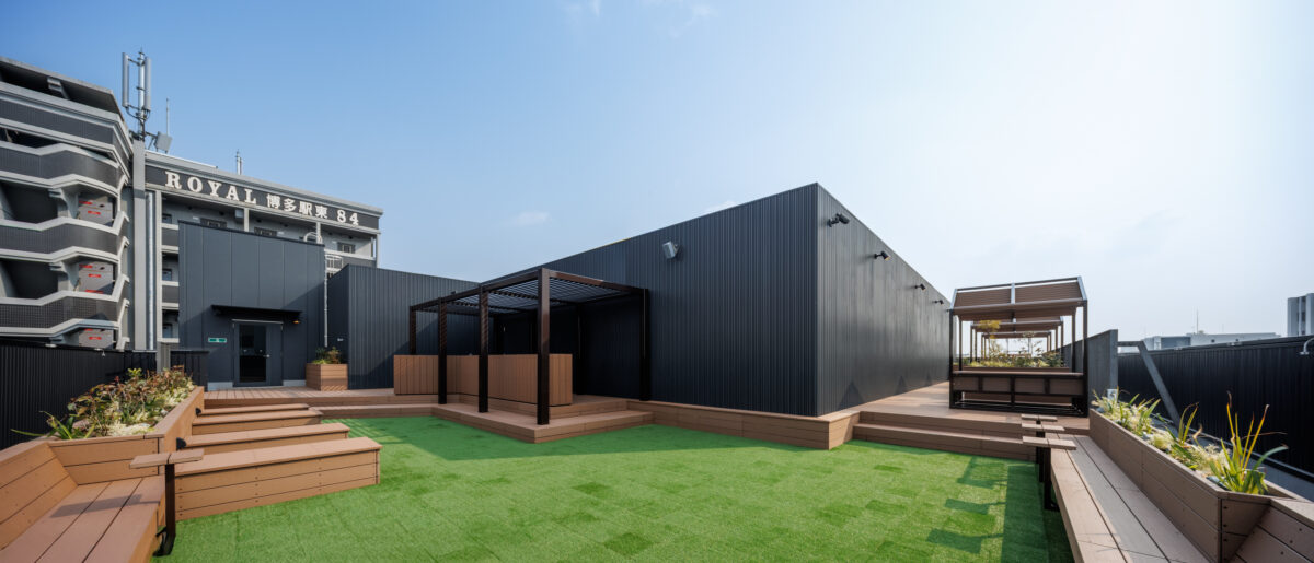 屋上には、「ウェルビーイング」をテーマとした共用空間「S-GATEテラス」を整備しました。ウッドデッキと芝生を組み合わせた開放的な空間で、ランチや休憩といったリフレッシュの場としてはもちろん、屋外で気分を変えて仕事をする場としても活用できます。