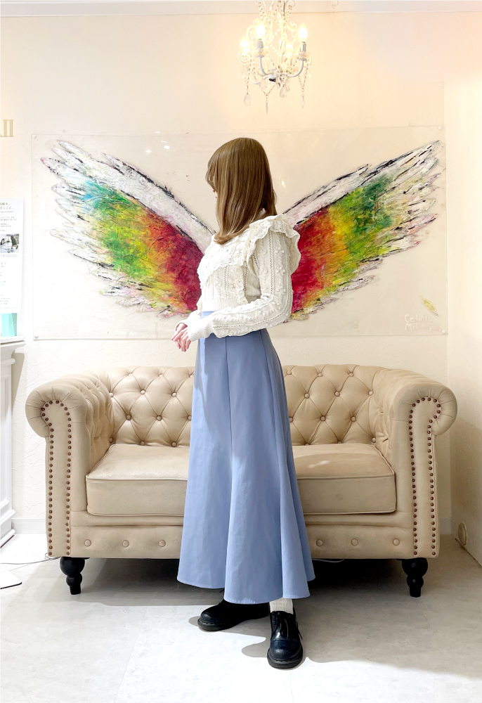 購入したブレスレットを身につけ、ソファに座って撮影することで、手元の天然石ジュエリーと背中に広がる天使の羽が美しく収まり、表参道店でしか叶わないフォトジェニックな一枚が完成いたします。