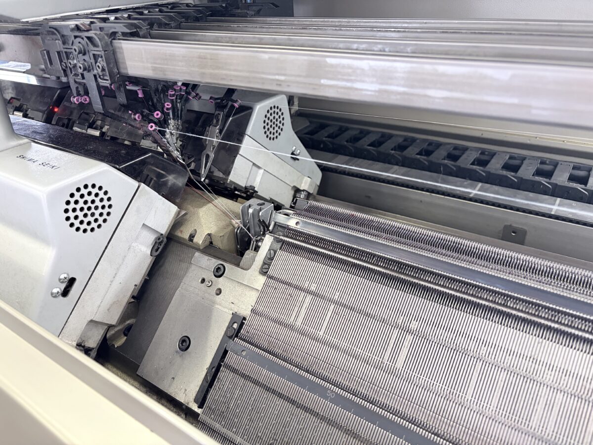 「こいのぼり」の形状にあわせて編み上げる髙井ニットでの製作⼯程。⽷には再⽣ポリエステルを利⽤している。