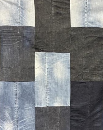 無印良品の店舗で回収されたデニムを活⽤したパッチワーク。会場では「こいのぼり」の姿となって披露される。