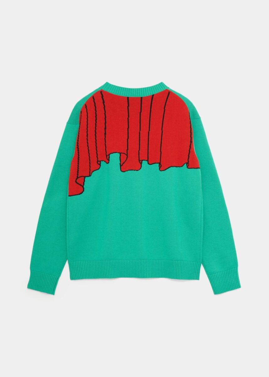 「もともと小さなものを拡大したような質感や、古い雑誌やアメコミの線を取り込んで組み合わせる制作手法が好きなので、その雰囲気がジャガード織で再現されていると感じました。ファミコンのようなドット感が表現されていて嬉しかったです。また、自分が大切にしている赤・青・黄色・黒のトーンが忠実に再現されていると感じました。個展の初日や、少し特別な場所へ出かける日に着たい一着。これまでTシャツやスウェットは数多く制作してきましたが、ニットとのコラボは初めてで、自分自身も着たいと思える仕上がりになりました。」