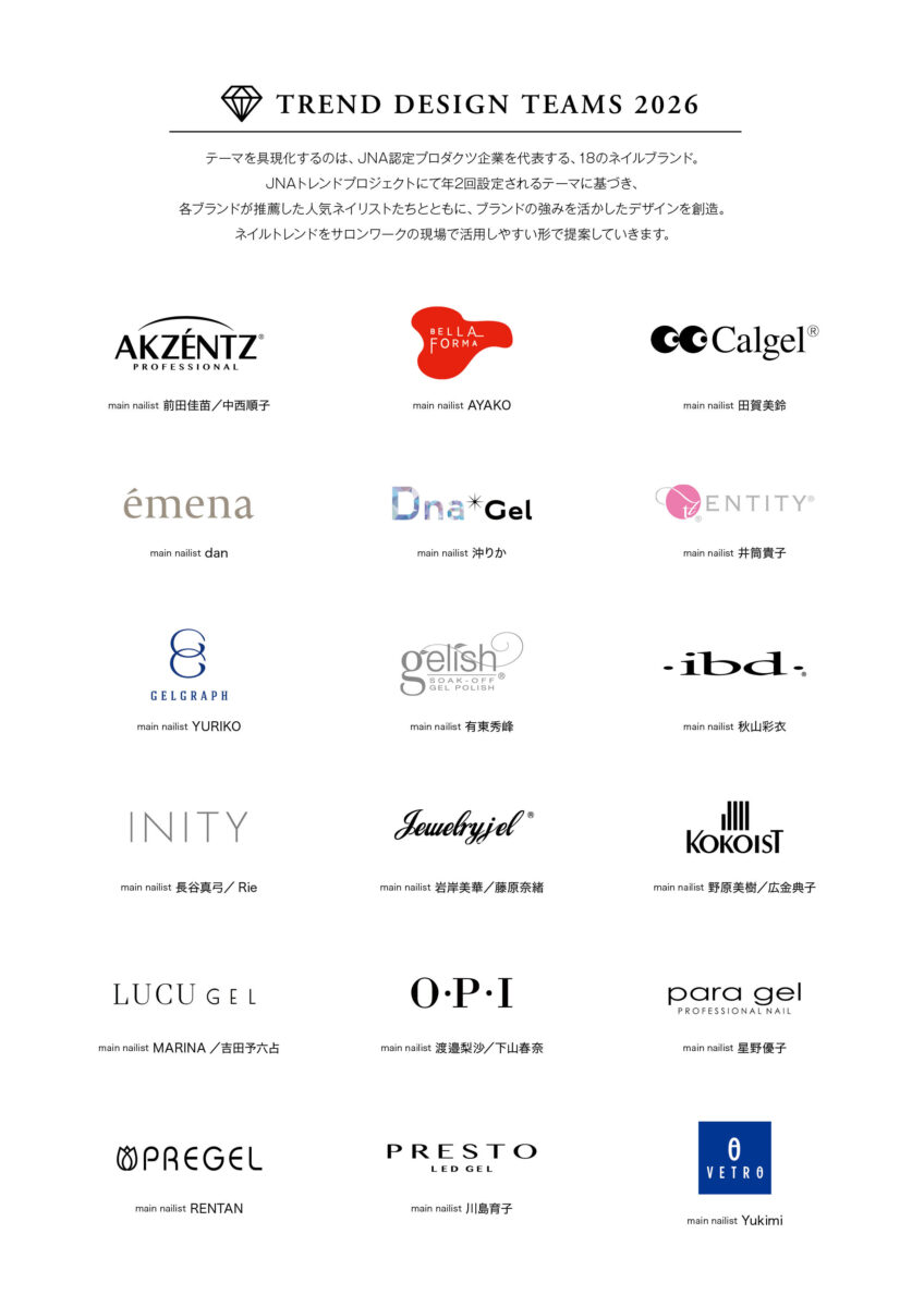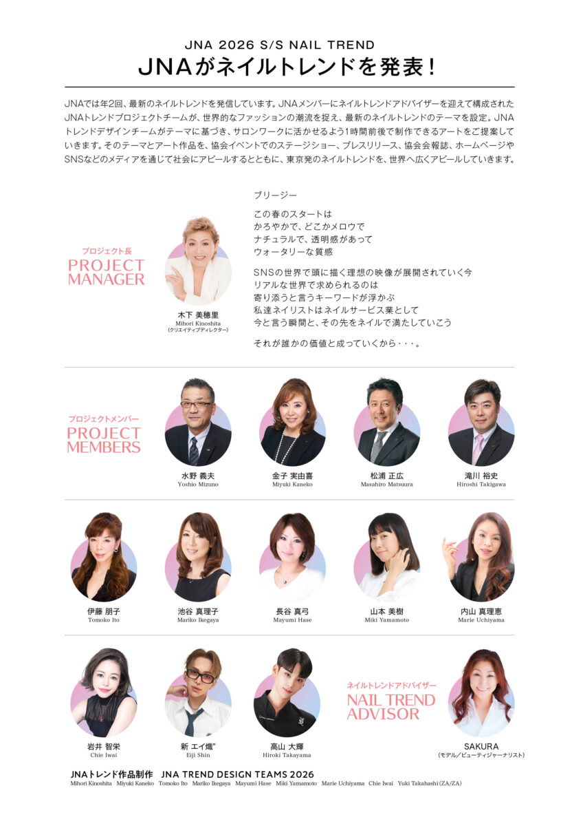 このネイルトレンドは、世界的なファッションの潮流なども踏まえ、「JNA ネイルトレンドプロジェクト(プロジェクト長 木下美穂里)」 が年2回設定し、発表しています。日本ネイリスト協会メンバーに、ネイルトレンドアドバイザーとしてモデル/ビューティジャーナリストSAKURAさんを迎え、熟考し作り上げたテーマを元に、JNAトレンドデザインチーム(JNA認定プロダクツ企業から選抜されたネイルブランドと一流ネイリスト)が、ネイルサロンのお客様に提供するアイディアとして、ネイル作品制作を担当しています。