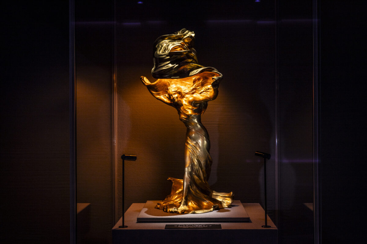 プレスガラスやサンドブラスト、カーヴィングなどの技法を駆使し、ガラスと金属、水を組み合わせたこの噴水は、装飾性と構造性を兼ね備えた造形によって、ルネ・ラリックの卓越した才能を示しており、アール・デコ期の最高傑作といえます。現在、飛驒高山美術館のロビー中央に据えられた本作は、空間の中心で水音と光をまといながら、来館者を迎え入れています。制作から100年を経た今日においても、この噴水は、ガラス芸術が装飾から空間体験へと展開していった流れを体感させる存在として、本展のテーマを象徴しています。