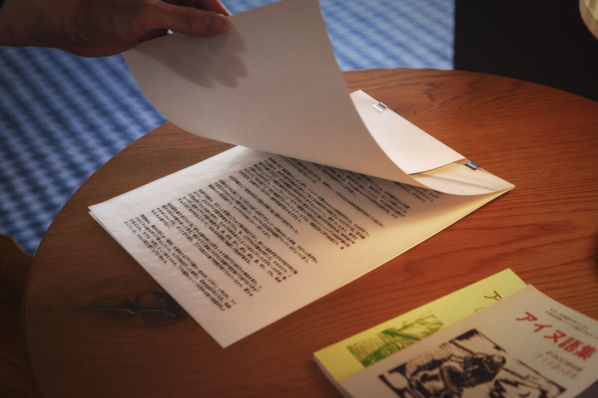 層雲峡で書いた散文詩を、薄いアイヌ語集で逐語置換し、訳せない語を空白として残したZINE。空白は失われた言語層を可視化し、薄紙の日本語が下層の断片を覆いながら透かす。覆う/残す矛盾を造本で固定する。
