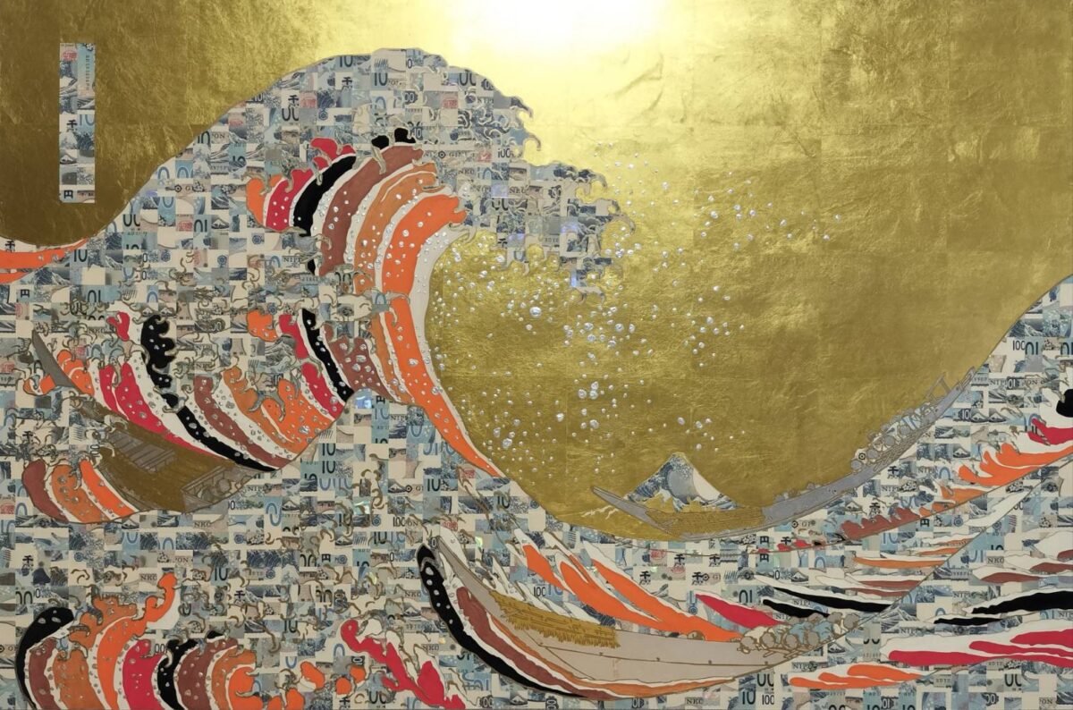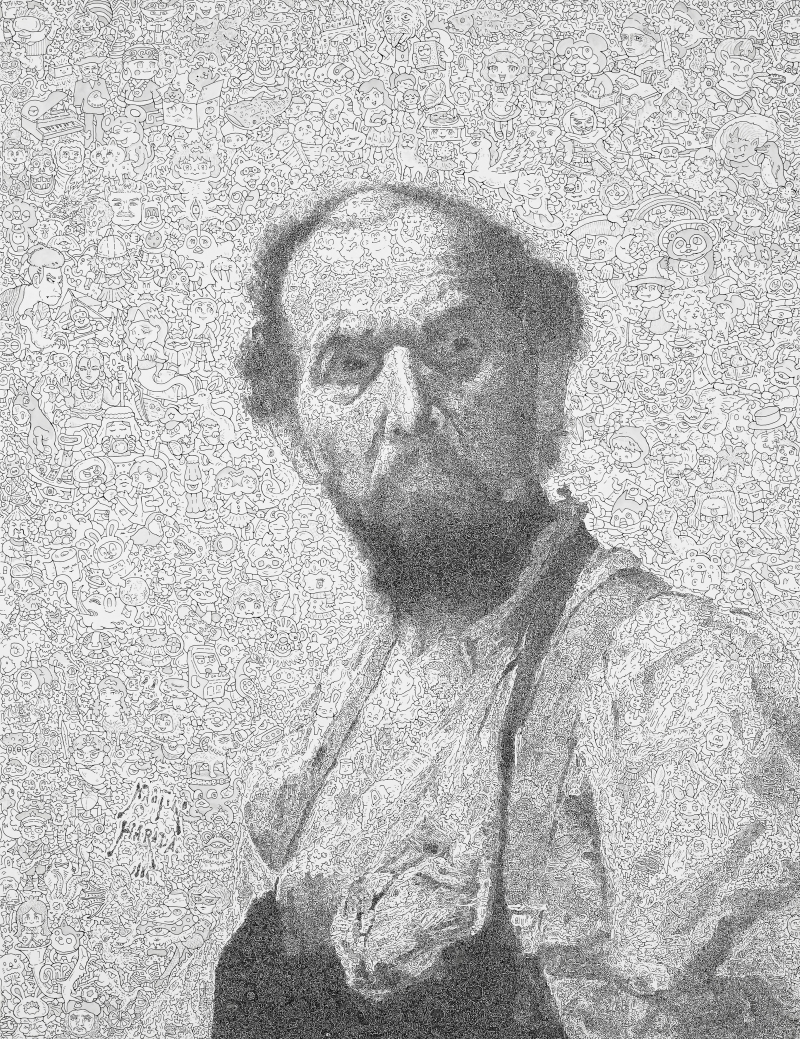 サガキケイタの作品は、一見すると有名な古典絵画やアイコン的なイメージを再現したものに見えるが、近づいて観ると無数の小さなキャラクターや即興的なドローイングによって構成されているという独自の手法が特徴である。