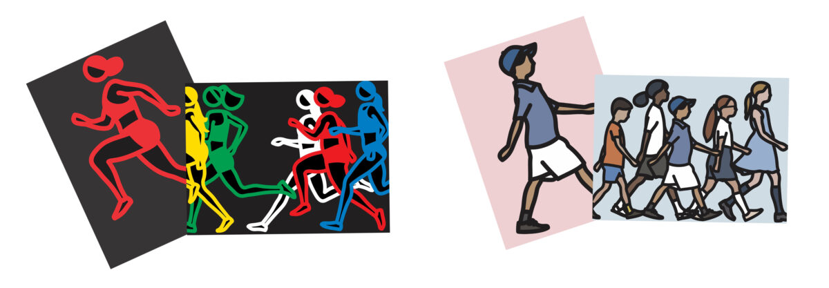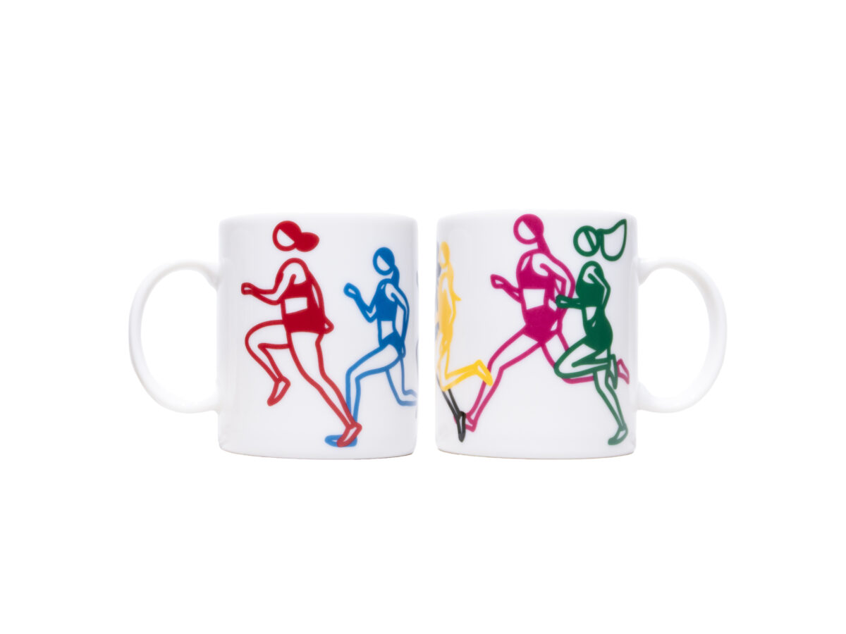 2025年9月からGINZA SIXの中央吹き抜けに展示されている≪Marathon. Women.≫は、吹き抜け空間に浮かぶように設置されたLEDサイネージを舞台に、カラフルでシンプルな線で描かれたランナーたちの姿がそれぞれの速度で駆け抜けていくインスタレーション。展示環境そのものに強い関心を持ったジュリアン・オピーが、賑やかな空間において意味を持ち、かつ自然に溶け込むような作品を目指して制作した、自身初の「宙に浮かぶ」映像の大型インスタレーションとなる意欲作です。「走る」という人間の本能的な動きが空間全体に浸透し、訪れる人々に没入感と新たな気づきをもたらす本作は、GINZA SIXの中央吹き抜け空間の特性を生かし、フロアを移動しながら上下左右さまざまな角度から鑑賞できる、同空間初の“動き”のある作品です。