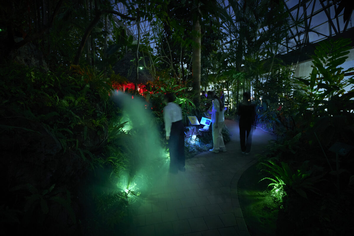 夜の夢の島熱帯植物館を舞台に、3日間限定で体験型インスタレーション 「Aerosculpture ver.2『匂う森』」 が開催されました。本展覧会は、夜のバイオームを舞台に、「共生」をテーマとした体験型インスタレーション作品です。