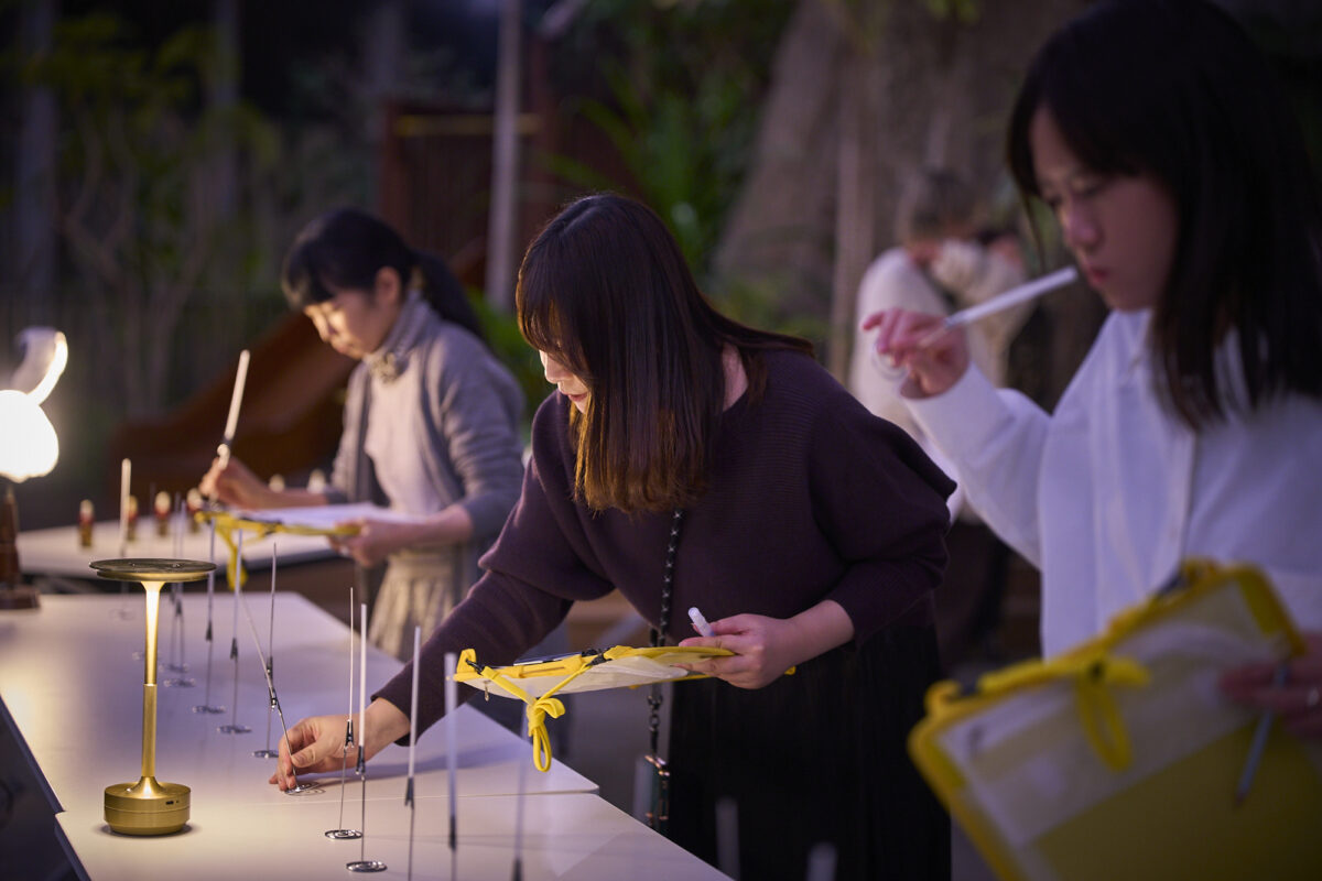 ドーム内には、熱帯の代表的な夜の送粉者(ポリネーター)である蛾(ガ)やコウモリの嗅覚的な関係性に着想を得た仕掛けを各所に設置。匂い・風・音・光が重なり合う空間の中で、来場者は自然の営みと人工の仕掛けが重なる感覚を身体で体感し、嗅覚を頼りに森を歩く体験を楽しみました。また、関連ワークショップ 「メッセージとしての香り — 交信フレグランス」 では、参加者が展示空間の「空気」に関与できるツールとして香りを制作。この体験を通じて、参加者は感覚と空間が交差する新しい嗅覚体験を味わいました。