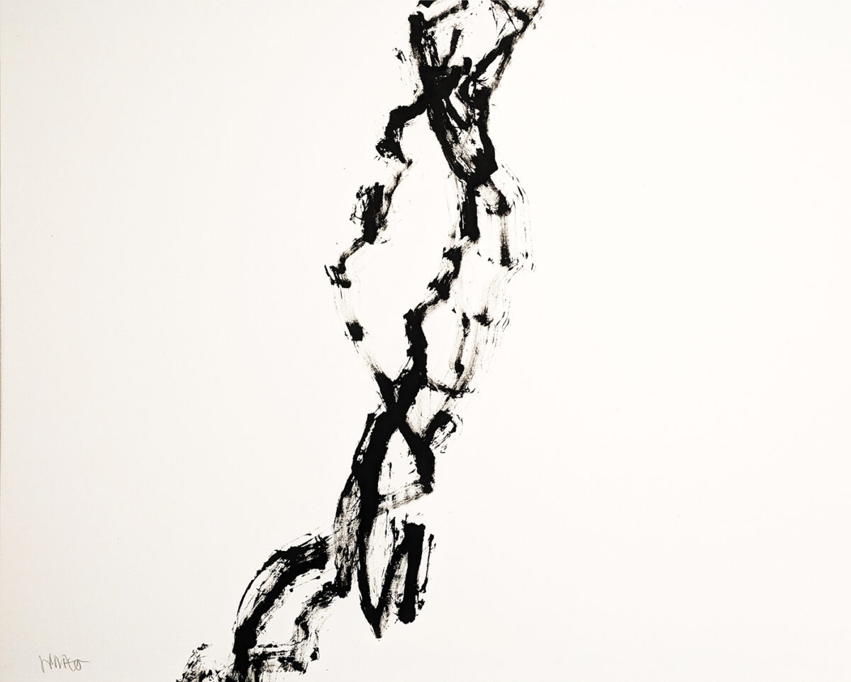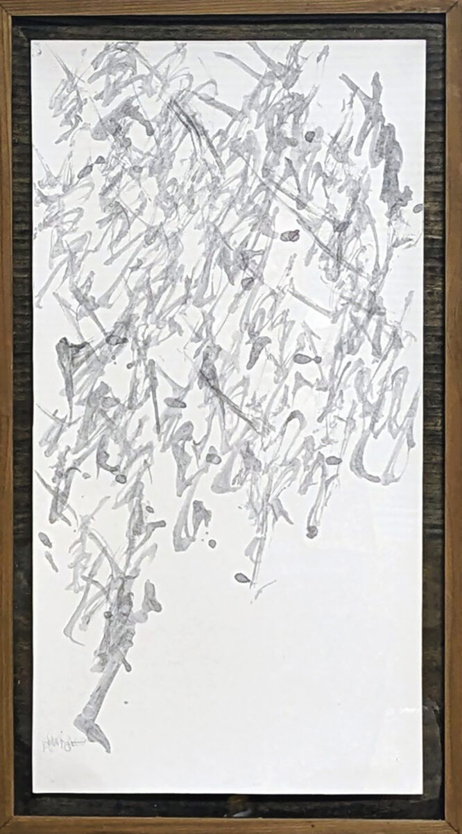 見えているものは、ほんの表層にすぎません。墨は沈み、線は迷い、書は意味を失うことで心の深層へと触れていきます。墨の滲み、掠れ、重なりは、理性の膜を破り、意識の奥へと沈み込む軌跡です。そこにあるのは答えではなく、深さそのもの。意味が発生する直前、思考がかたちになる手前。ここにあるのは言葉ではなく、痕跡であると、伊藤は語ります。