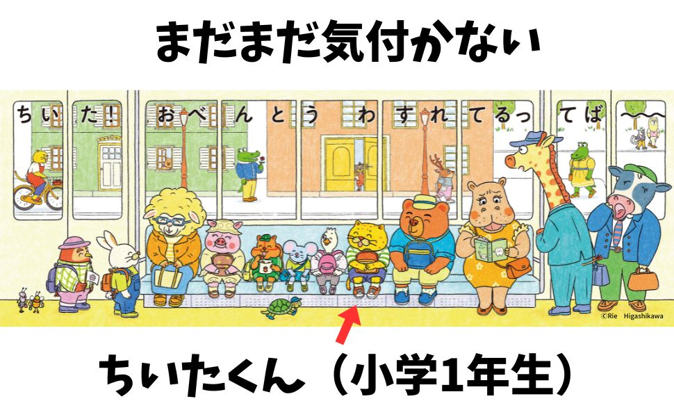何とか気付いてもらおうとしているママと、応援する動物たち。そんな窓の外の様子に全く気付かず平和に遠足を楽しんでいる電車内とのギャップがまた面白い!