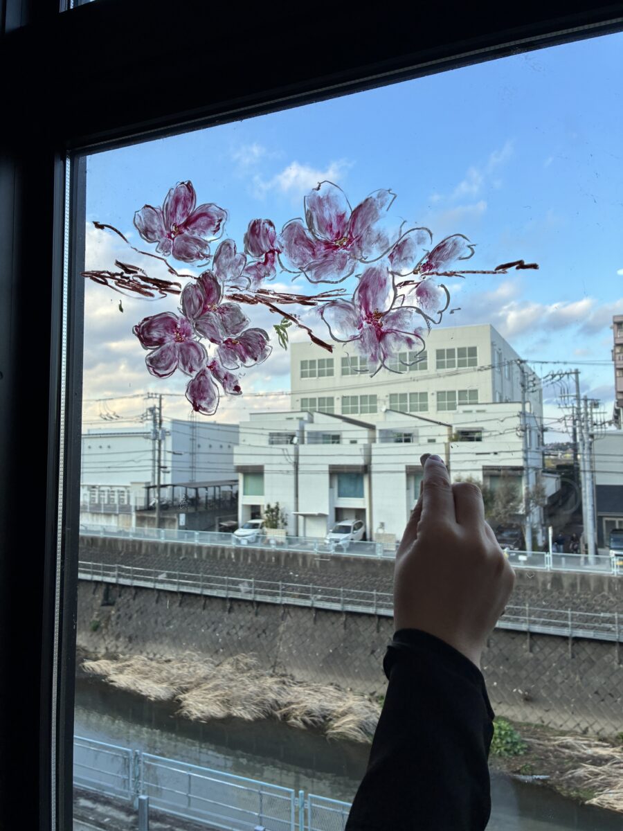 自宅の窓ガラスにキットパスで桜の花や花びら、桜の木を描いてInstagramに投稿