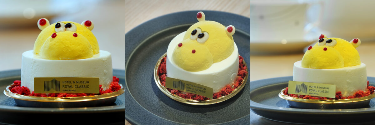 このたび、同氏の承認を得て、同シリーズの「黄色いカバ」作品に着想を得たオリジナルケーキを制作し、ホテル内カフェラウンジにて販売中です。なお、本商品は期間限定・数量限定でのご提供となります。