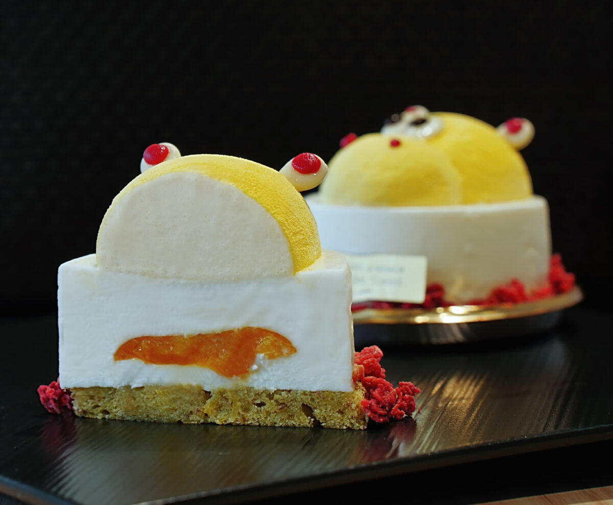 The upper hippo-shaped portion is crafted from mandarin orange mousse, offering a fruity richness and gentle sweetness. Delicate white chocolate is used to create its charming button-like eyes.