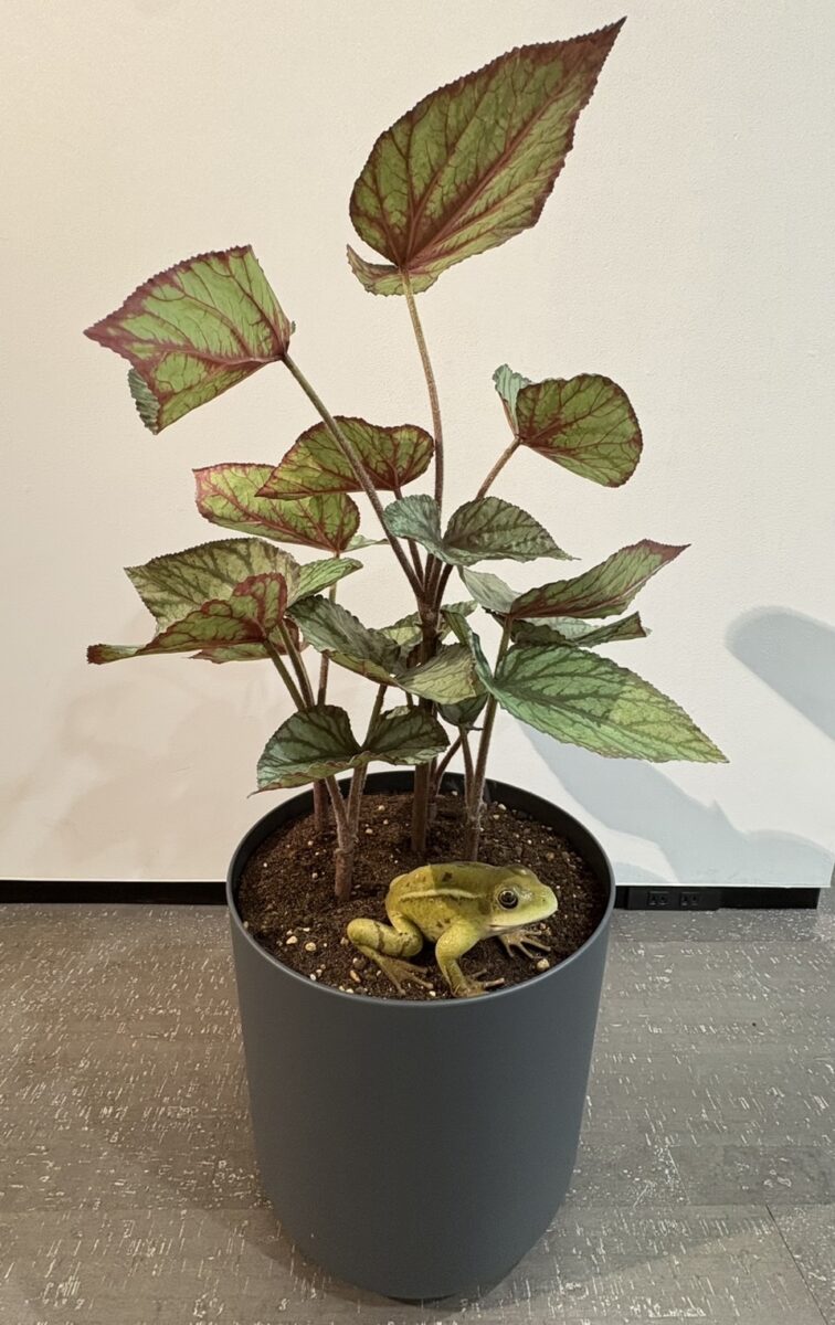 At first glance, the work appears to be an ordinary potted plant. Yet as visitors walk past, a child’s voice can suddenly be heard. Curious to find its source, one leans closer—only to discover a small frog emerging from the leaves.