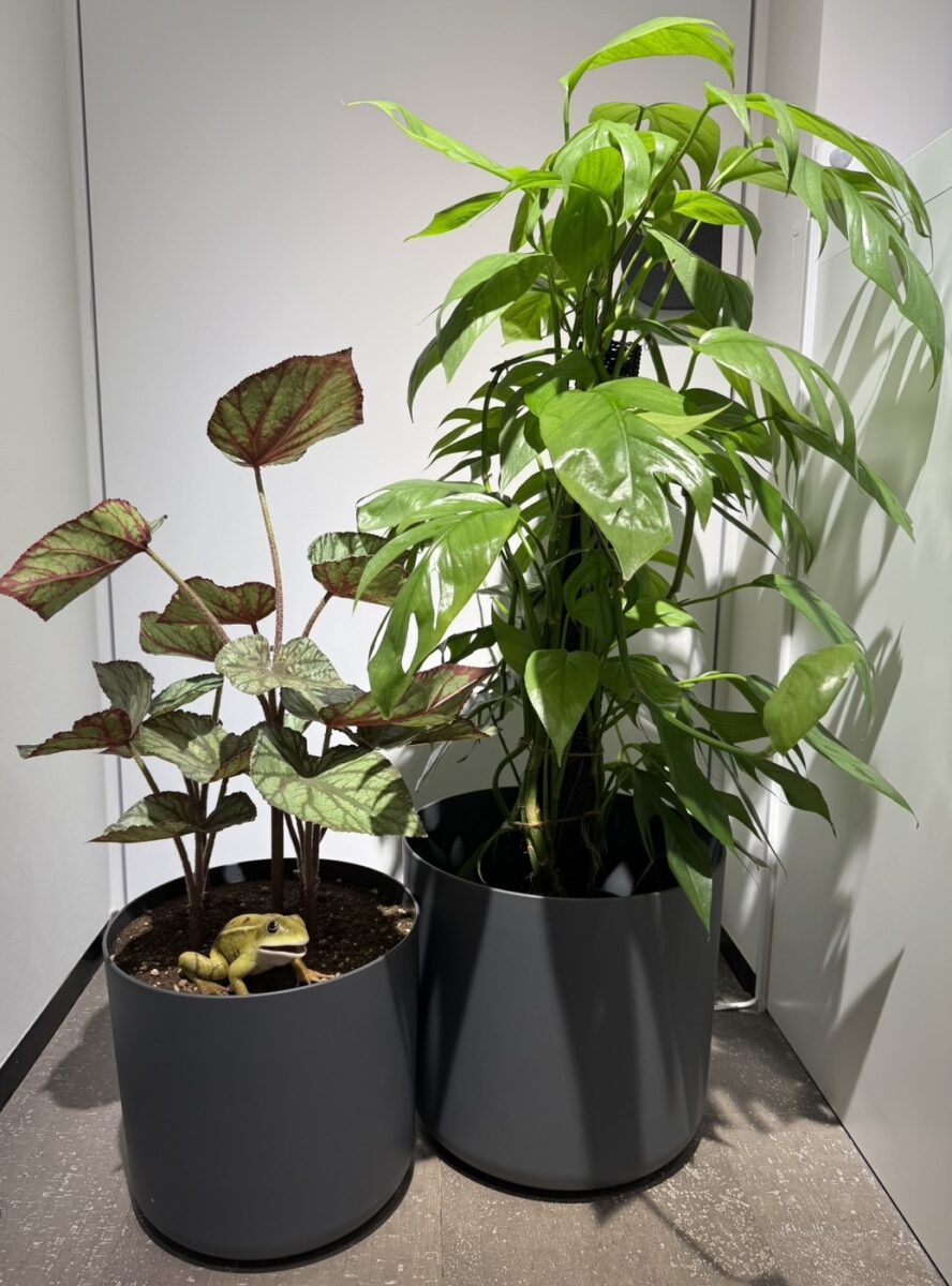 一見すると何気なく置かれた植物の鉢ですが、その前を通りがかると、どこからともなく子どもの声が聞こえてきます。声の出どころを探して身を屈めると、鉢の葉陰から一匹のカエルが姿を現します。