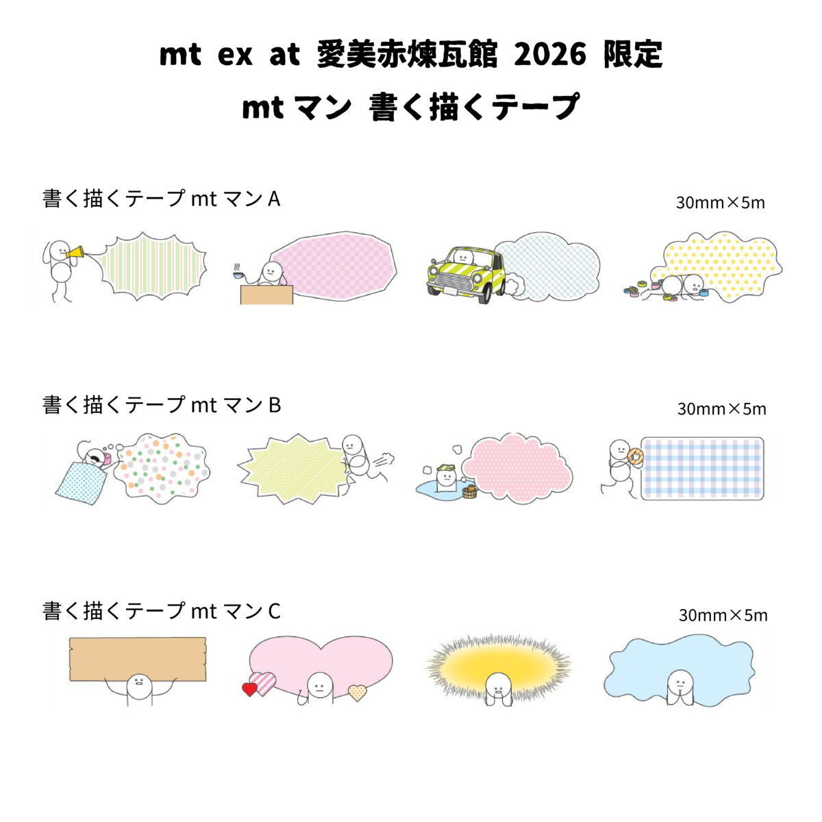 通常のmtに比べて筆記性をUPし、鉛筆や水性ペンでも文字が書ける「mt書く描くテープ」に、大人気のmtオリジナルキャラクター・mtマン デザインが登場!