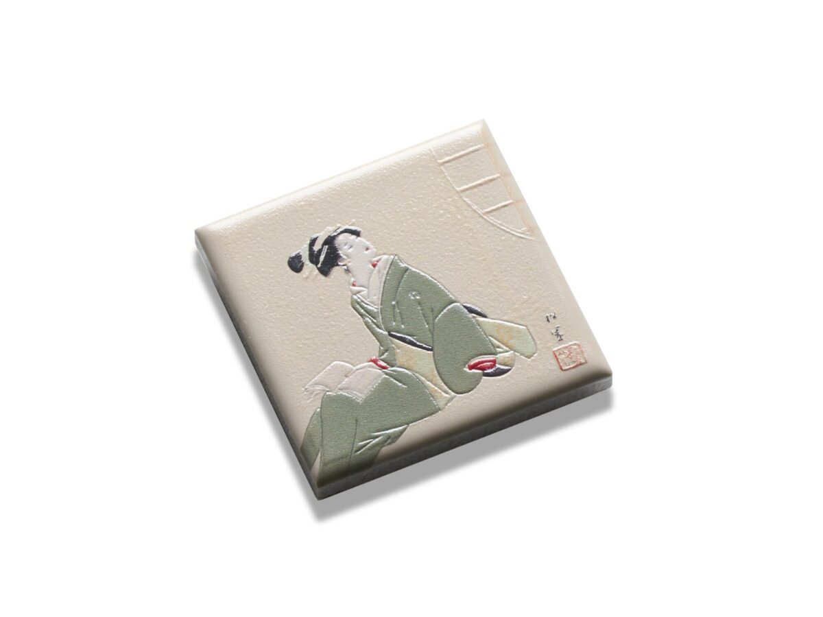 読書中に外から聞こえてきたホトトギスの声に、ふと顔を上げた瞬間の女性の姿を描いた作品です。静けさの中に広がる鳥の存在や音の余韻を想像しながら、その優しい空気感を表現するため、背景部分に和紙のようなやわらかい質感の凹凸を加えました。女性の優しい表情や着物のシルエットは、丸みのある起伏で立体的に表現しています。丸窓の外に広がる景色まで想像がふくらむ、穏やかな時間を閉じ込めたマグネットです。