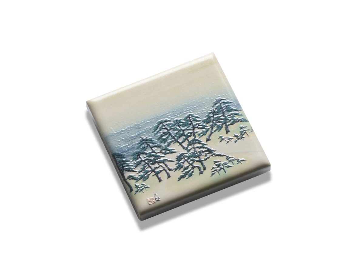 朝日に照らされた海を描き、激動の時代の中でも失ってはならない日本の自然と精神を表した作品です。遠くに見える波の動きに微細な凹凸をつけて立体的に表現するとともに、手前に広がる松林に高さを出すことで、奥へと続く海の広がりを強調しています。黒松の力強さと、朝の光に包まれる爽やかな海の気配が感じられる仕上がりとなっています。横山大観ならではのダイナミックさと繊細さが凝縮されたマグネットです。