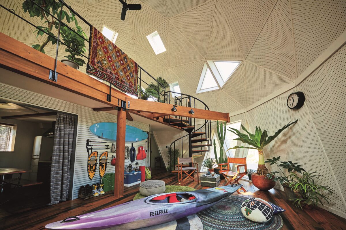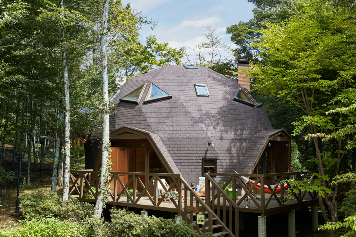BESSドームは、数学者・建築家バックミンスター・フラー氏が考案したジオデシック・ドーム理論をベースに、三角形105枚を組み合わせた半球体の住宅です。家は四角くなければならない、という常識を覆し、自然の合理性を宿した丸いフォルムが、強烈な存在感を与えます。