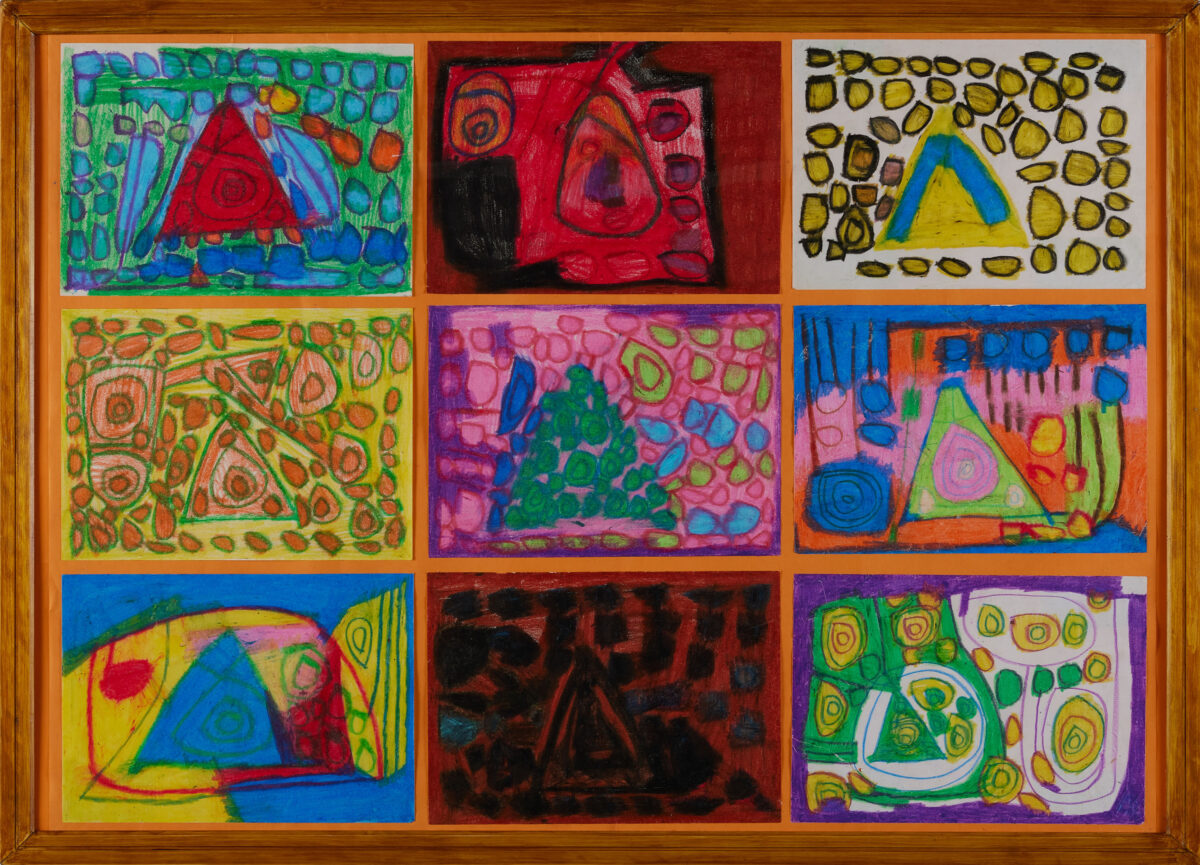 絵を描くことに幼いころから関心を示し、寡黙ながらひたむきに制作に向き合うカー・ハンを、両親は温かく支えてきた。当初はパステルや絵の具を用いていたが、ほどなく、自身の制作スタイルには、色鉛筆がより適していることに気づく。描き続けるにつれて作品はさらに洗練され、徐々に抽象性を増していく。大きな白い紙の上に鋭く削った色鉛筆を用いて、幾層にも色を重ねる。何か月にもわたり、深い集中力とエネルギーをもって描き続けることで、作品は次第に鮮やかな輝きを帯びていく。そうして生み出された形象の連なりは、布地や絨毯、あるいは刺繍を思わせる趣を感じさせる。