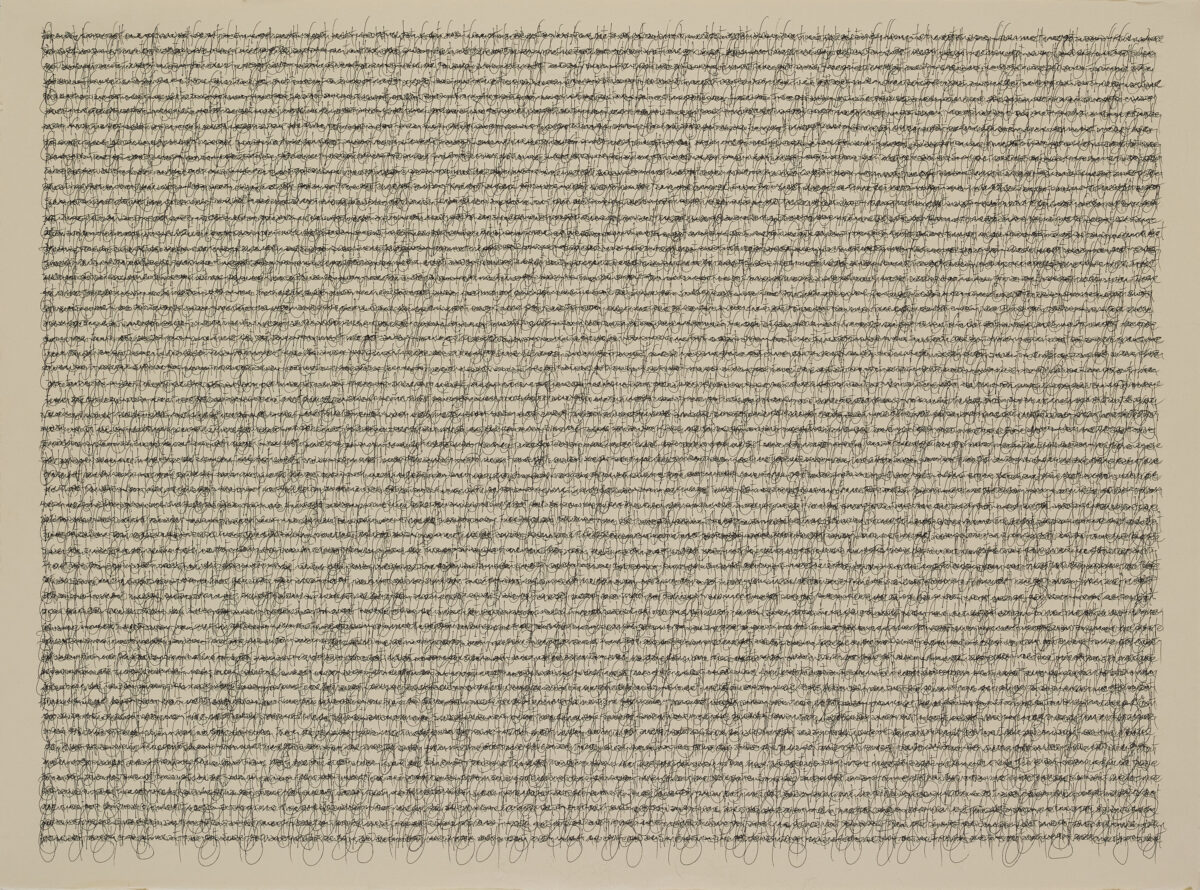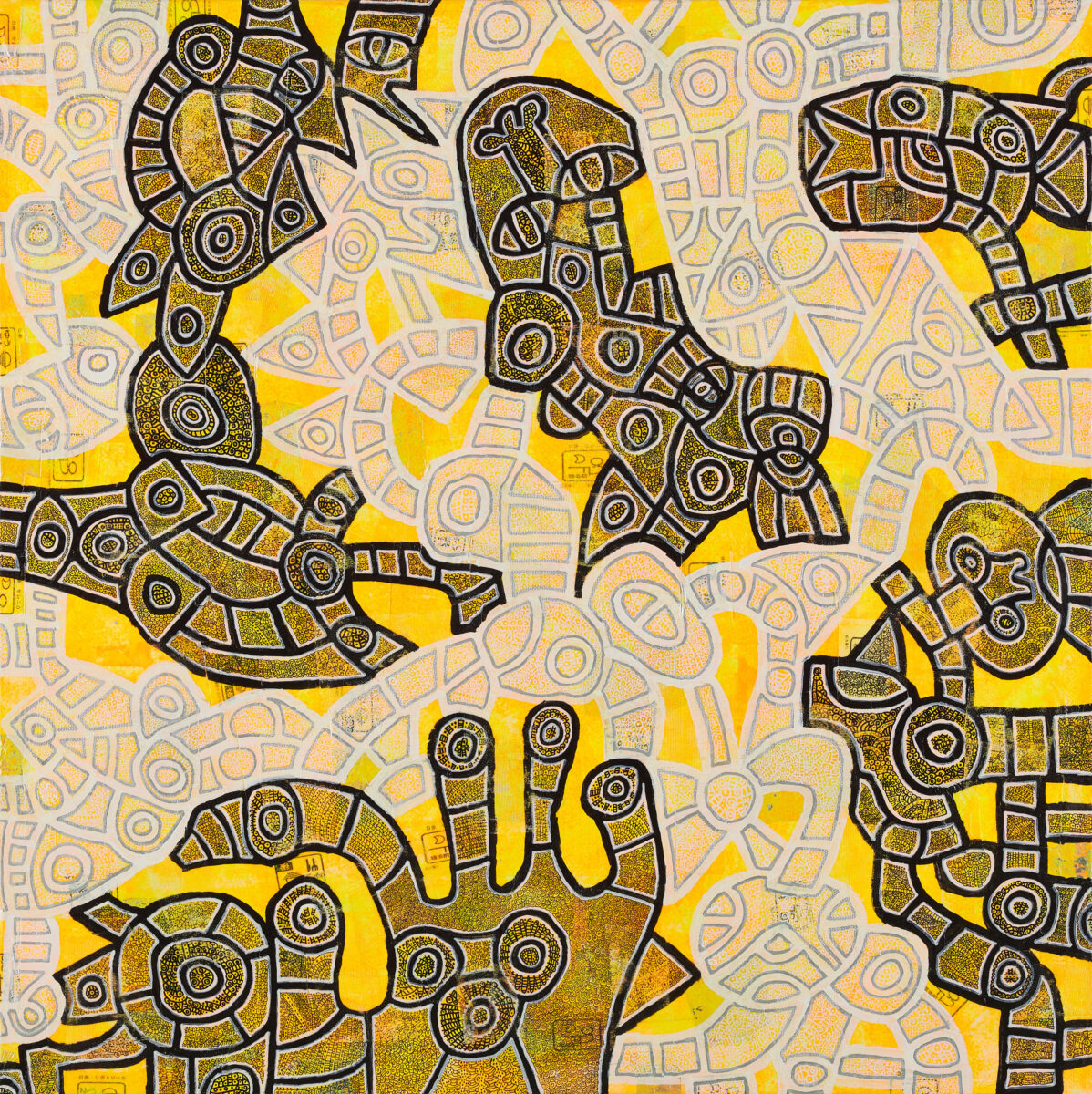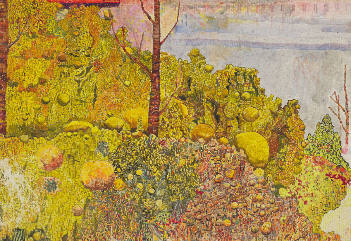 カー・ハン・ムイの作品の大胆な構成には、一目で強く惹きつけられた。画面の下部は、円形と反復する渦巻きの有機的な集合体で満たされ、上三分の一は、線的なテクスチャーの力強いまとまりと暗色の帯状の層によって占められている。こうした要素の組み合わせは、形式的抽象への確かな感覚がうかがえると同時に、地図や考古学的図版を彷彿とさせる。緑がかった茶色と黒を基調とする色彩は、隠された構造を掘り起こし、その姿を地中からあらわにするような感覚をいっそう際立たせる。その印象は、オーストリア生まれの建築家・芸術家フリーデンスライヒ・フンデルトヴァッサーによる、生物形態的な住宅建築や環境に配慮したデザインにも通じる。カー・ハン・ムイが提示する世界。それは庭園であり、ポータル(門)でもある。どこか人を惹きつけてやまない場所であり、私たちそれぞれの物語が展開していく舞台背景となる空間なのだ。