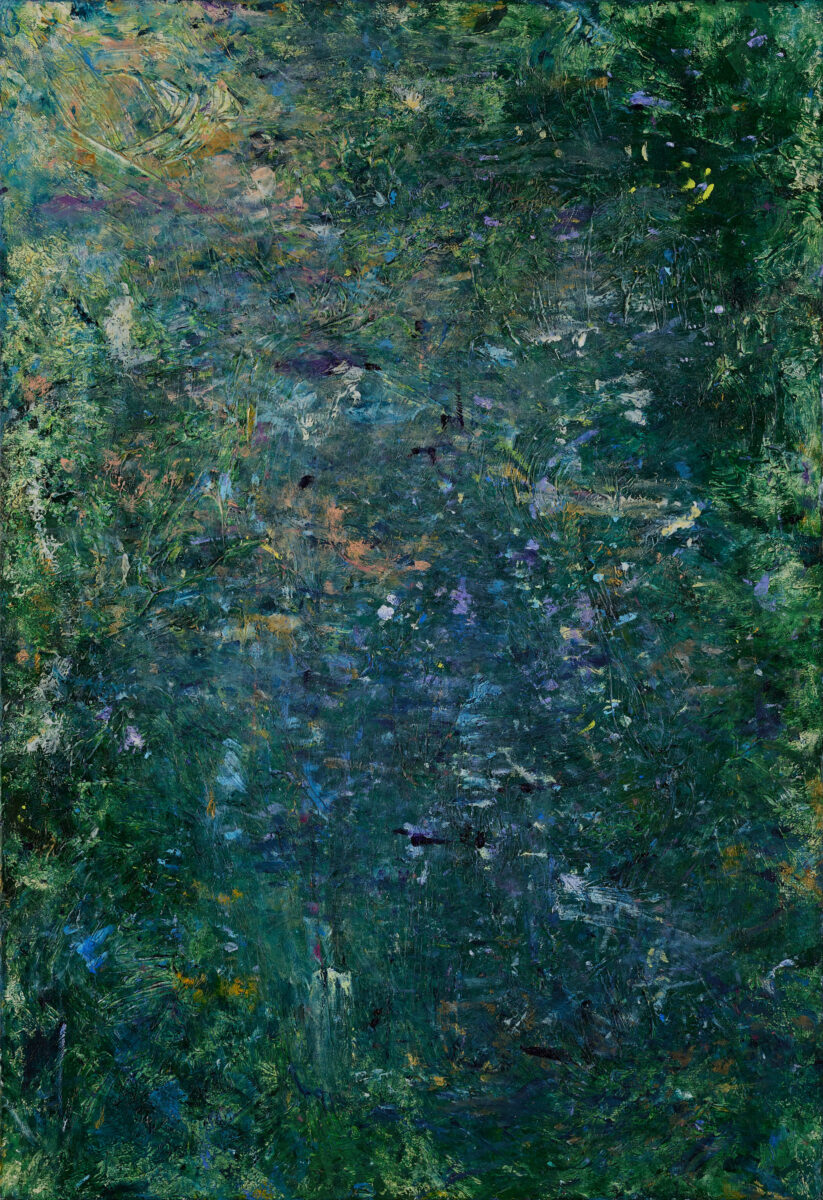 深いエメラルドグリーンを基調に、青緑や黄緑、くすんだオリーブの色層が幾重にも重なり、画面には水面をのぞき込むような静かな奥行きが生まれている。中央にゆるやかに弧を描く形態は、器の縁のようでもあり、地形の輪郭のようでもあり、見る者の記憶や感覚に静かに触れる。同時に、この作品は詩的で穏やかな印象をたたえながらも、形態の輪郭や色面の関係は驚くほどシャープでクリーンである。細かな線や点の反復は、遠くでかすかに響く音のようなリズムを生み、画面に精緻な秩序を与えている。静けさと明晰さが高い次元で共存する造形の強度を評価し、本作をグランプリに選出した。