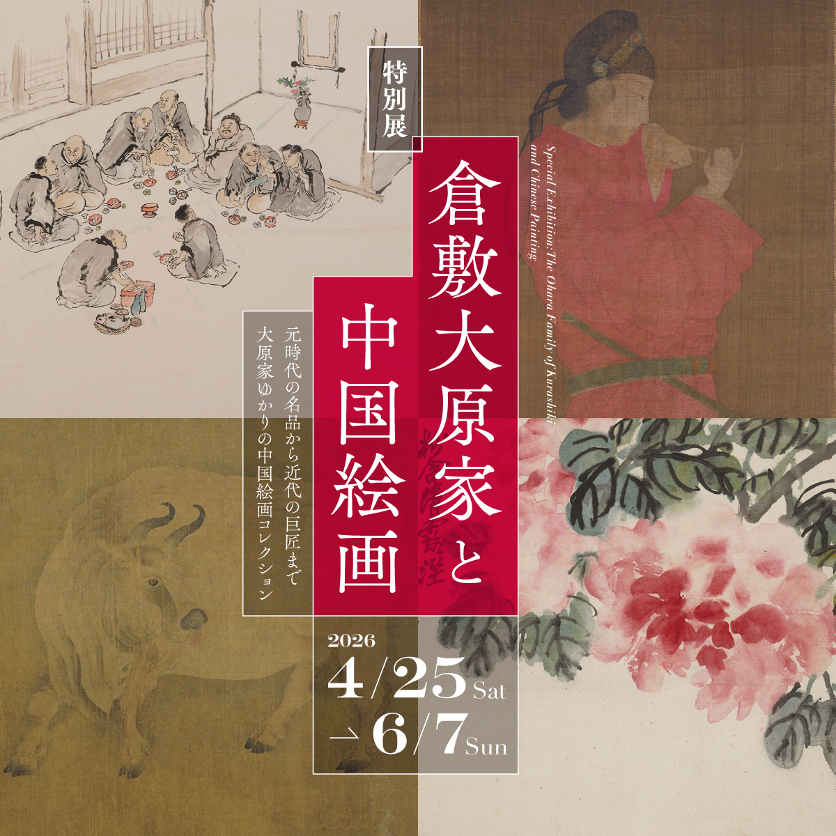 本展は、大原家の六代目である孝四郎(1833-1910)、七代目の孫三郎(1880-1943)、八代目の總一郎(1909-1968)を中心に、大原家代々が収集し愛賞した中国絵画をご紹介するものです。倉敷紡績初代社長をつとめ、近代産業資本家としての大原家の基盤をつくった孝四郎。西日本屈指の企業家として活躍するとともに、希代の社会事業家としても名を残した孫三郎。戦後の倉敷レイヨン(現クラレ)を率い、理想をあきらめないその姿勢から「美しい経済人」と評された總一郎。彼らの手による中国絵画コレクションには、時代を超えて受け継がれる中国文化への敬愛とともに、変貌を遂げていく日中関係と時代の様相が映し出されているといえるでしょう。室町将軍家旧蔵品、いわゆる「東山御物」であり、古渡の名品として名高い国宝《宮女図》をはじめ、開国間もない日本で繰り広げられた清人画家との交流を物語る胡鉄梅作《謙受堂雅集図》(初公開)、中国最後の文人といわれ、近代日中文化交流でも大きな役割を果たした呉昌碩作《墨梅図》など、元時代より近代に至るまで、国宝2件、重要文化財2件と多数の初公開作品を含む展示作品により、大原家と中国絵画との関わりを紐解いていきます。
